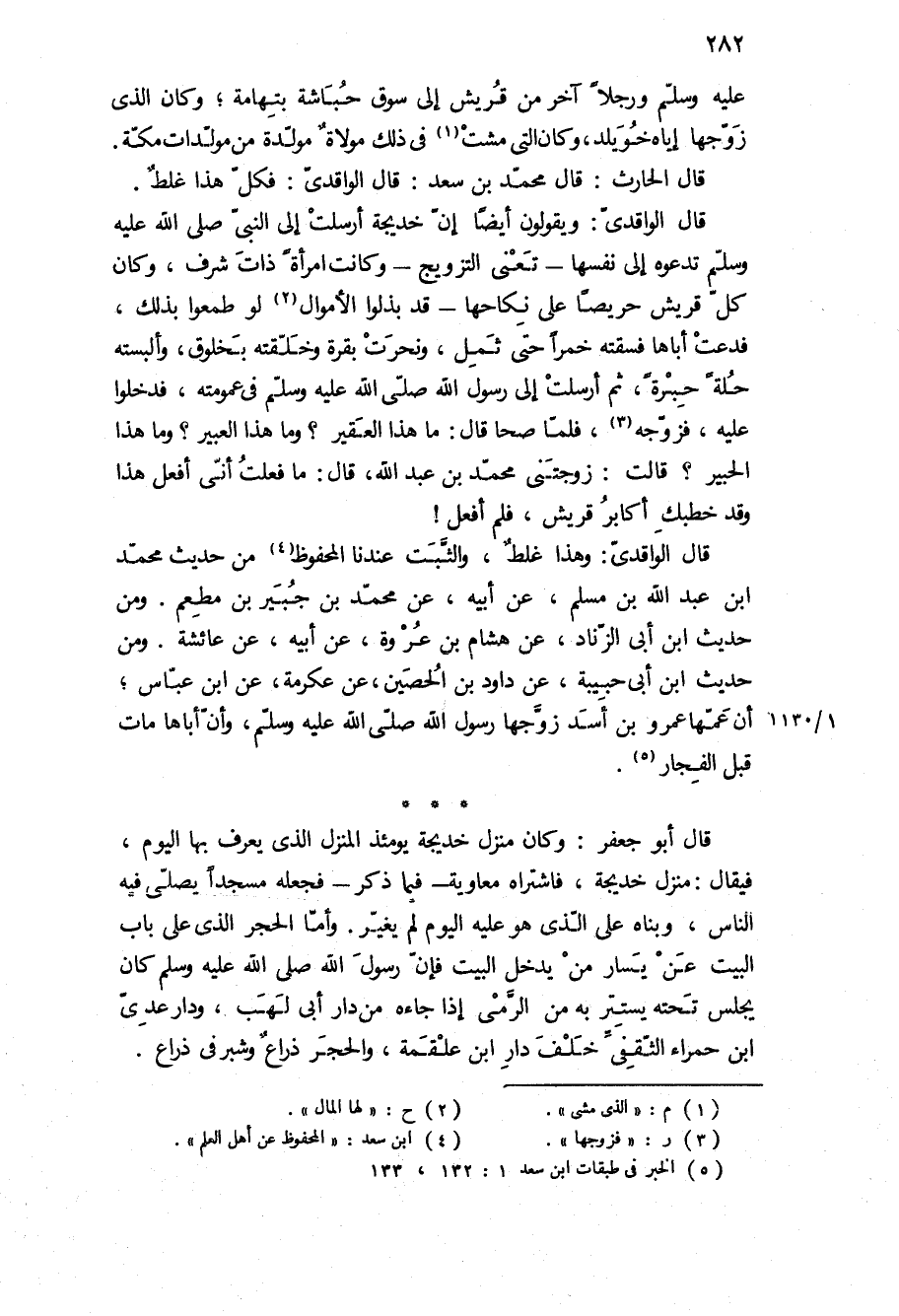 قال الواقدي: ويقولون أيضا إن خديجة أرسلت إلى النبي ص تدعوه إلى نفسها- تعني التزويج- وكانت امرأة ذات شرف، وكان كل قريش حريصا على نكاحها- قد بذلوا الأموال لو طمعوا بذلك، فدعت أباها فسقته خمرا حتى ثمل، ونحرت بقرة وخلقته بخلوق، وألبسته حلة حبرة، ثم أرسلت الى رسول الله ص في عمومته، فدخلوا عليه، فزوجه، فلما صحا قال: ما هذا العقير؟ وما هذا العبير؟ وما هذا الحبير؟ قالت: زوجتني محمد بن عبد الله، قال: ما فعلت أنى أفعل هذا وقد خطبك أكابر قريش، فلم أفعل! قال الواقدي: وهذا غلط، والثبت عندنا المحفوظ من حديث محمد ابن عَبْدِ اللَّهِ بْنِ مُسْلِمٍ، عَنْ أَبِيهِ، عَنْ مُحَمَّدِ بْنِ جُبَيْرِ بْنِ مُطْعِمٍ وَمِنْ حَدِيثِ ابْنِ أَبِي الزِّنَادِ، عَنْ هِشَامِ بْنِ عُرْوَةَ، عَنْ أَبِيهِ، عَنْ عَائِشَةَ وَمِنْ حَدِيثِ ابْنِ أَبِي حَبِيبَةَ، عَنْ دَاوُدَ بْنِ الْحُصَيْنِ، عَنْ عِكْرِمَةَ، عَنِ ابْنِ عَبَّاسٍ، أَنْ عَمَّهَا عَمْرَو بن اسد زوجها رسول الله ص، وَأَنَّ أَبَاهَا مَاتَ قَبْلَ الْفِجَارِ.