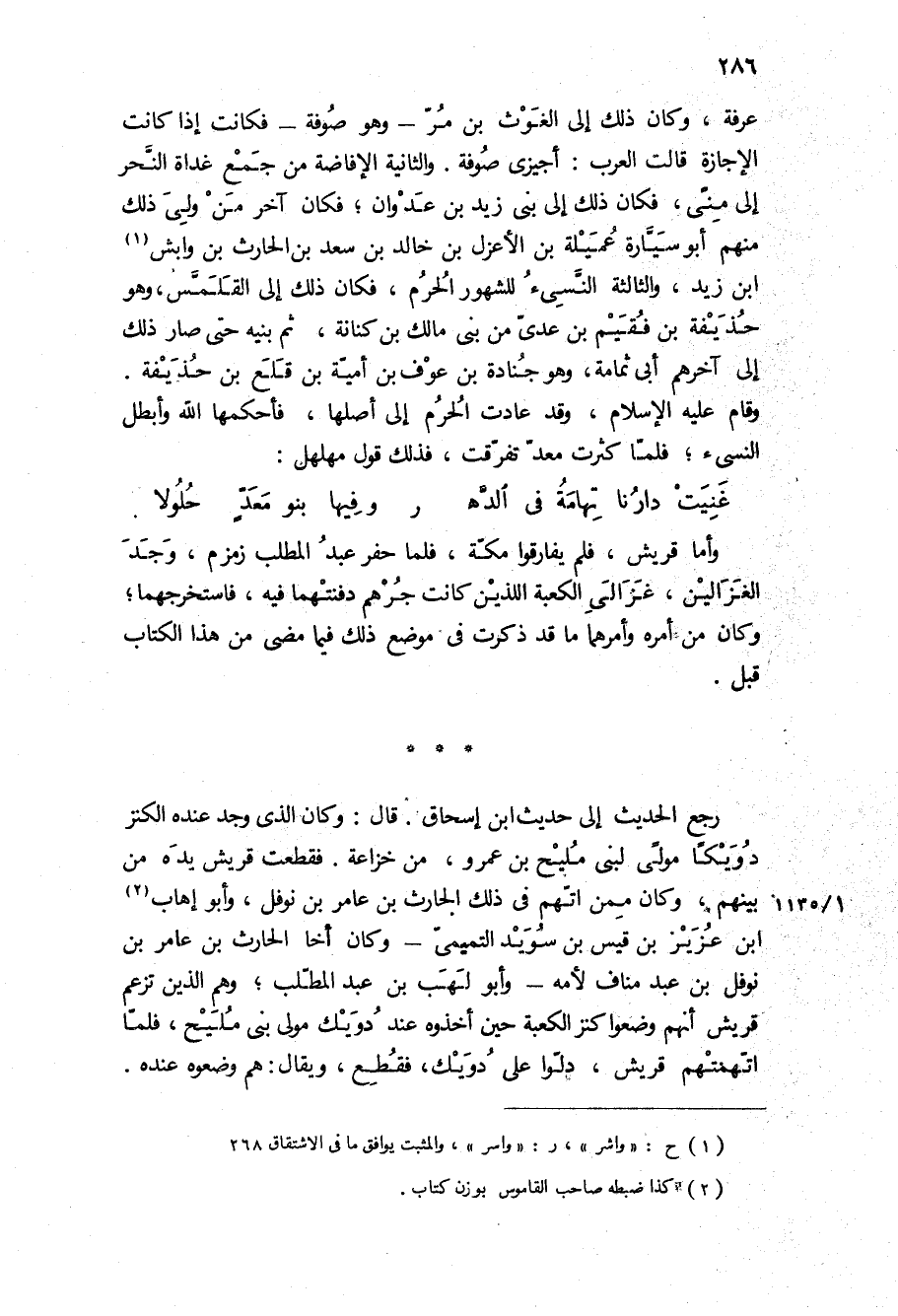 عرفة، وكان ذلك إلى الغوث بن مر- وهو صوفة- فكانت إذا كانت الإجازة قالت العرب: أجيزي صوفة والثانية الإفاضة من جمع غداة النحر إلى منى، فكان ذلك إلى بني زيد بن عدوان، فكان آخر من ولي ذلك منهم أبو سيارة عميلة بن الأعزل بن خالد بن سعد بن الحارث بن وابش ابن زيد، والثالثة النسيء للشهور الحرم، فكان ذلك إلى القلمس، وهو حذيفة بن فقيم بن عدي من بني مالك بن كنانة، ثم بنيه حتى صار ذلك إلى آخرهم أبي ثمامة، وهو جنادة بن عوف بن أمية بن قلع بن حذيفة.