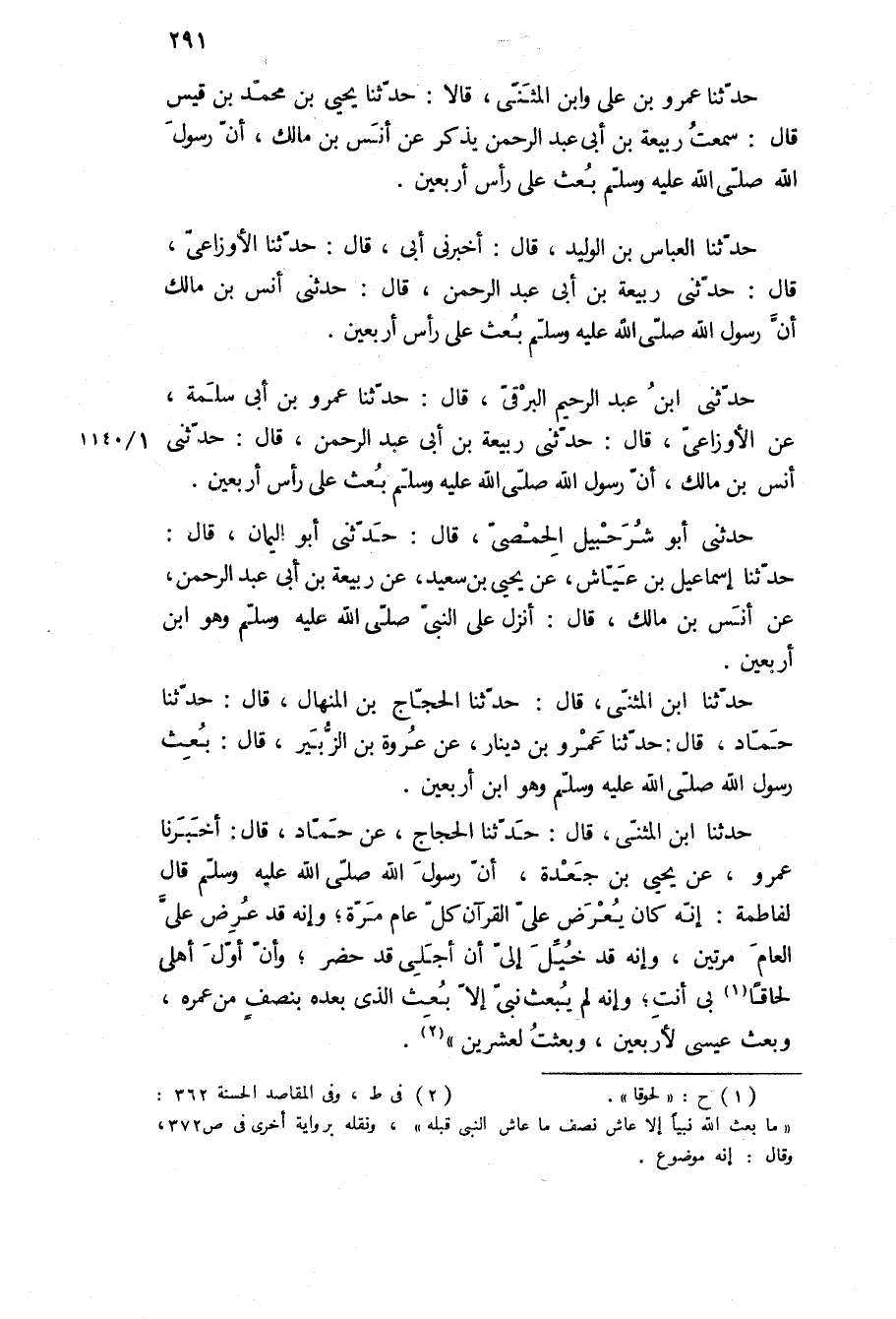 حَدَّثَنَا الْعَبَّاسُ بْنُ الْوَلِيدِ، قَالَ: أَخْبَرَنِي أَبِي، قَالَ: حَدَّثَنَا الأَوْزَاعِيُّ، قَالَ: حَدَّثَنِي رَبِيعَةُ بْنُ أَبِي عَبْدِ الرَّحْمَنِ، قَالَ: حَدَّثَنِي أَنَسُ بْنُ مَالِكٍ أَنَّ رَسُولَ الله ص بُعِثَ عَلَى رَأْسِ أَرْبَعِينَ.