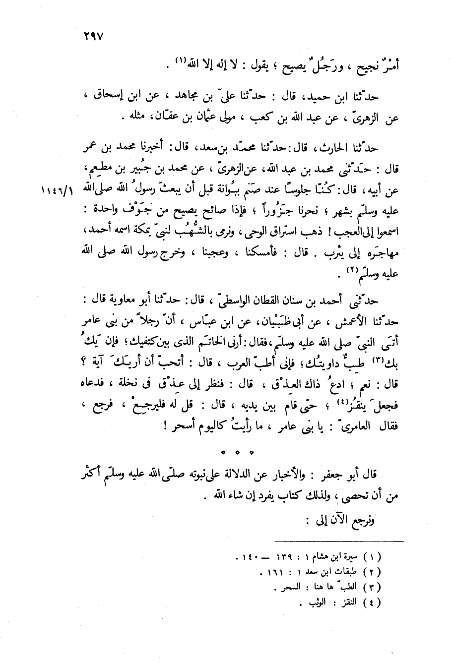 قَالَ: نَعَمْ، ادْعُ ذَاكَ الْعِذْقَ، قَالَ: فَنَظَرَ إِلَى عِذْقٍ فِي نَخْلَةٍ، فَدَعَاهُ فَجَعَلَ يُنْقِزُ، حَتَّى قَامَ بَيْنَ يَدَيْهِ، قَالَ: قُلْ لَهُ فَلْيَرْجِعْ، فَرَجَعَ، فَقَالَ الْعَامِرِيُّ: يَا بَنِي عَامِرٍ، مَا رَأَيْتُ كَالْيَوْمِ أَسْحَرَ!] قال أبو جعفر: والأخبار عن الدلالة على نبوته ص أكثر من أن تحصى، ولذلك كتاب يفرد إن شاء الله.