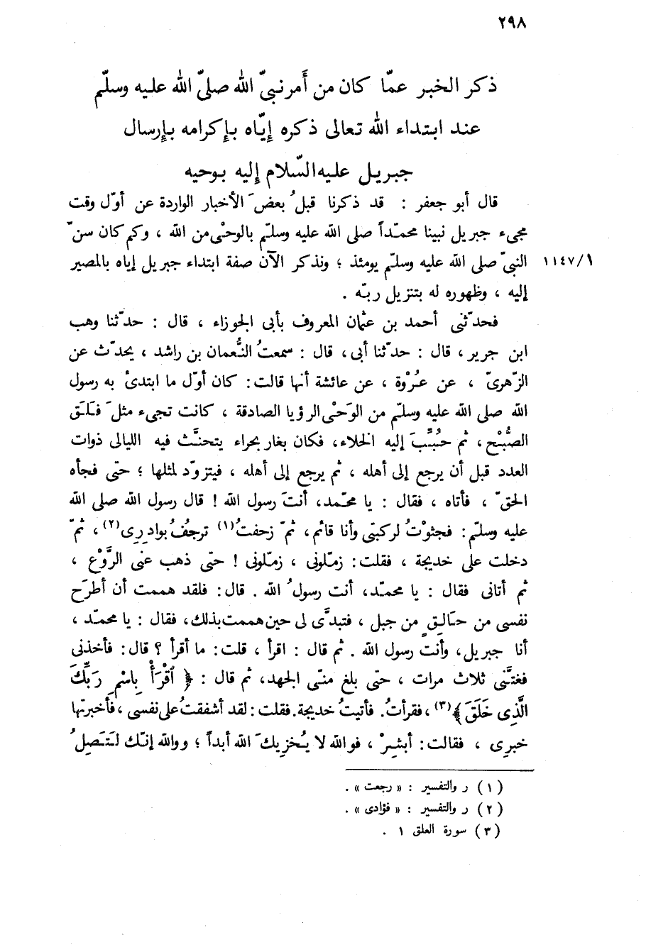 قال أبو جعفر: قد ذكرنا قبل بعض الأخبار الواردة عن أول وقت مجيء جبريل نبينا محمدا ص بالوحي من الله، وكم كان سن النبي ص يومئذ، ونذكر الآن صفة ابتداء جبريل إياه بالمصير إليه، وظهوره له بتنزيل ربه.