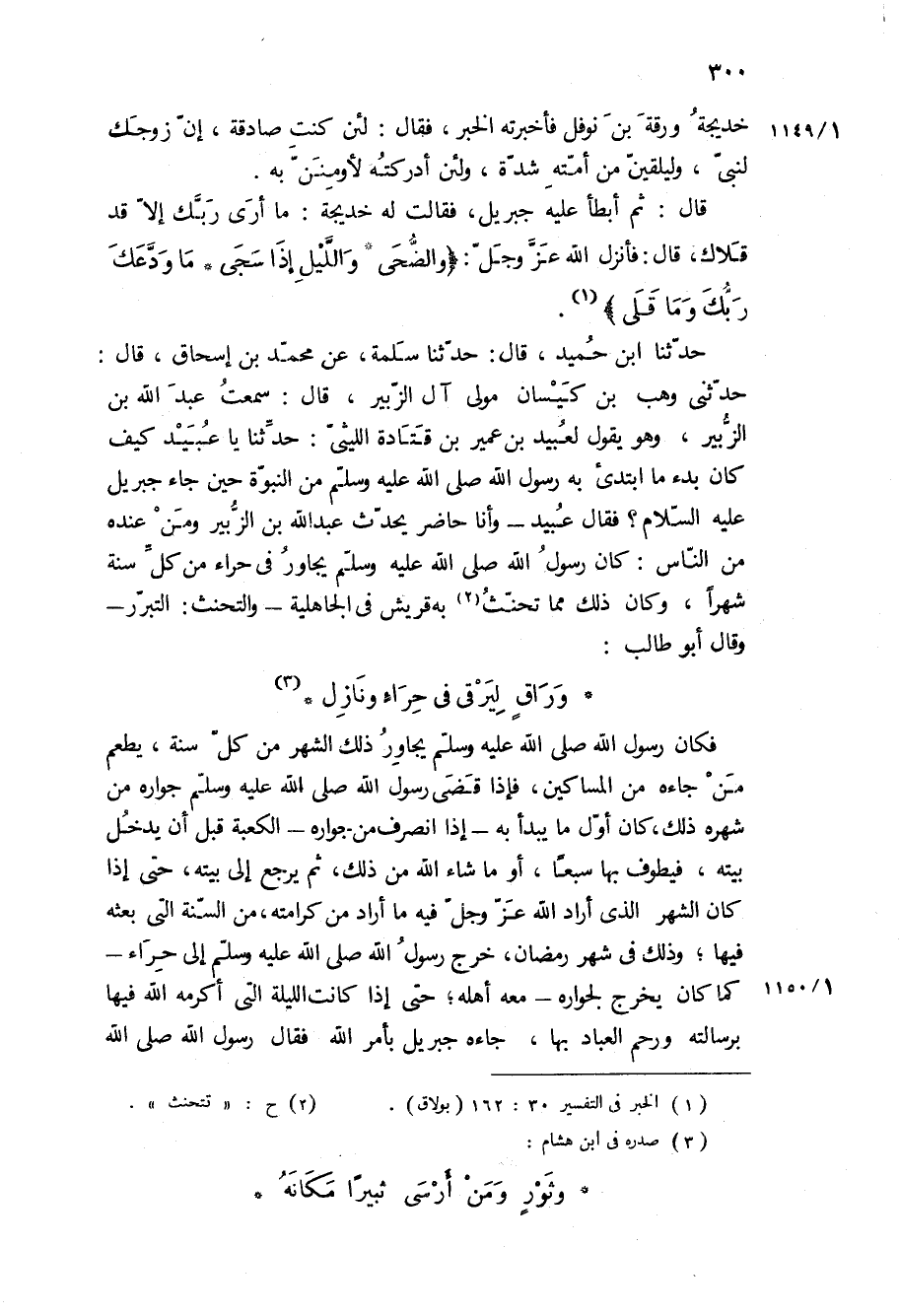 حَدَّثَنِي وَهْبُ بْنُ كَيْسَانَ مَوْلَى آلِ الزُّبَيْرِ، قَالَ: سَمِعْتُ عَبْدَ اللَّهِ بْنَ الزُّبَيْرِ، وَهُوَ يَقُولُ لِعُبَيْدِ بْنِ عُمَيْرِ بْنِ قَتَادَةَ اللَّيْثِيِّ: حَدِّثْنَا يَا عُبَيْدُ كَيْفَ كَانَ بَدْءُ مَا ابْتُدِئَ بِهِ رَسُولُ الله ص من النبوه حين جاء جبريل ع؟ فَقَالَ عُبَيْدٌ- وَأَنَا حَاضِرٌ يُحَدِّثُ عَبْدَ اللَّهِ بْنَ الزُّبَيْرِ وَمَنْ عِنْدَهُ مِنَ النَّاسِ: كَانَ رسول الله ص يجاور في حراء من كُلِّ سَنَةٍ شَهْرًا، وَكَانَ ذَلِكَ مِمَّا تَحَنَّثَ بِهِ قُرَيْشٌ فِي الْجَاهِلِيَّةِ- وَالتَّحَنُّثُ: التَّبَرُّرُ- وَقَالَ أَبُو طَالِبٍ: