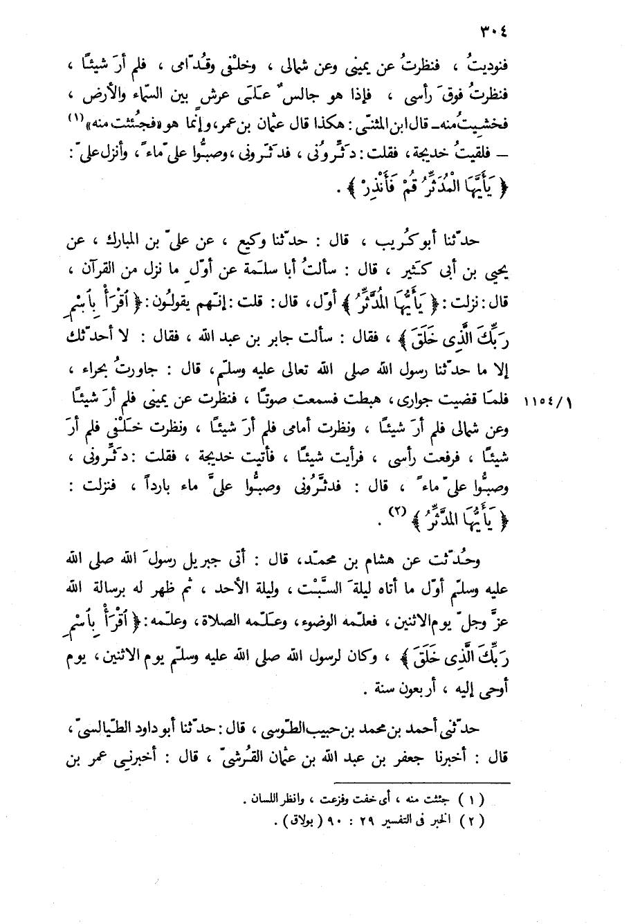 حدثنا أبو كريب، قال: حدثنا وكيع، عن عَلِيِّ بْنِ الْمُبَارَكِ، عَنْ يَحْيَى بْنِ أَبِي كَثِيرٍ، قَالَ: سَأَلْتُ أَبَا سَلَمَةَ عَنْ أَوَّلِ ما نزل من القرآن، قال: نزلت: «يا أَيُّهَا الْمُدَّثِّرُ» أَوَّلَ، قَالَ: قُلْتُ: إِنَّهُمْ يَقُولُونَ: «اقْرَأْ بِاسْمِ رَبِّكَ الَّذِي خَلَقَ» ، فَقَالَ: سَأَلْتُ جَابِرَ بْنَ عَبْدِ اللَّهِ، فَقَالَ: لا أُحَدِّثُكَ إِلا مَا [حَدَّثَنَا رَسُولُ اللَّهِ ص، قَالَ: جَاوَرْتُ بِحِرَاءٍ، فَلَمَّا قَضَيْتُ جِوَارِي، هَبَطْتُ فَسَمِعْتُ صَوْتًا، فَنَظَرْتُ عَنْ يَمِينِي فَلَمْ أَرَ شَيْئًا وَعَنْ شِمَالِي فَلَمْ أَرَ شَيْئًا، وَنَظَرْتُ أَمَامِي فَلَمْ أَرَ شَيْئًا، وَنَظَرْتُ خَلْفِي فَلَمْ أَرَ شَيْئًا، فَرَفَعْتُ رَأْسِي، فَرَأَيْتُ شَيْئًا، فَأَتَيْتُ خَدِيجَةَ، فَقُلْتُ: دَثِّرُونِي، وَصُبُّوا عَلَيَّ مَاءً، قَالَ: فدثرونى وصبوا على ماء باردا، فنزلت: