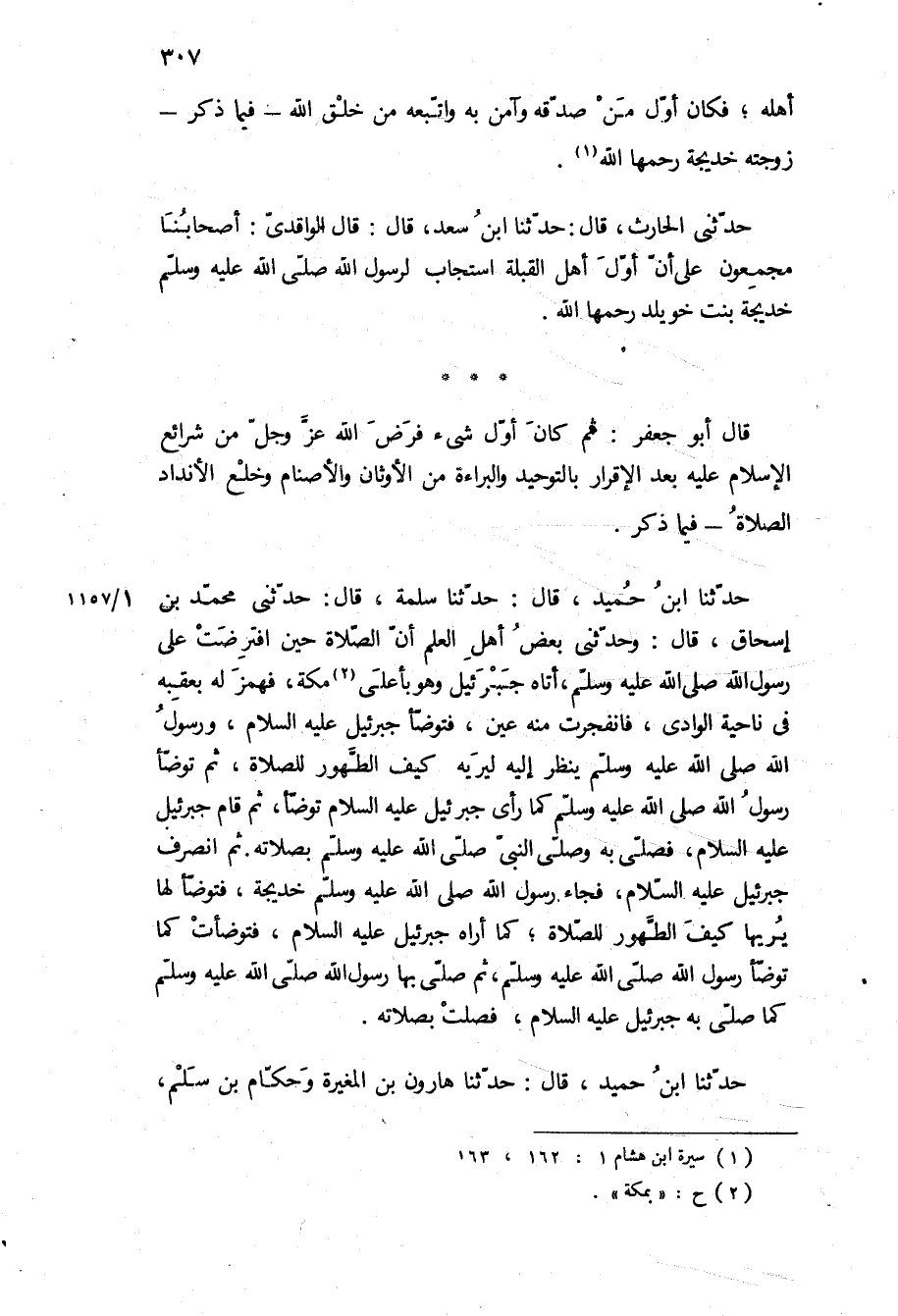 حَدَّثَنَا ابْنُ حُمَيْدٍ، قال: حدثنا سلمة، قال: حدثني محمد بن إِسْحَاقَ، قَالَ: وحدثني بَعْضُ أَهْلِ الْعِلْمِ أَنَّ الصلاة حين افترضت على رسول الله ص، أتاه جبرئيل وَهُوَ بِأَعْلَى مَكَّةَ، فَهَمَزَ لَهُ بِعَقِبِهِ فِي ناحيه الوادى، فانفجرت منه عين، فتوضأ جبرئيل ع، ورسول الله ص يَنْظُرُ إِلَيْهِ لِيُرِيَهُ كَيْفَ الطُّهُورُ لِلصَّلَاةِ، ثُمَّ توضأ رسول الله ص كما راى جبرئيل ع توضأ، ثم قام جبرئيل ع، فصلى به وصلى النبي ص بصلاته ثم انصرف جبرئيل ع، فجاء رسول الله ص خَدِيجَةَ، فَتَوَضَّأَ لَهَا يُرِيهَا كَيْفَ الطُّهُورُ لِلصَّلَاةِ، كما أراه جبرئيل ع، فتوضأت كما توضأ رسول الله ص، ثم صلى بها رسول الله ص كما صلى به جبرئيل ع، فَصَلَّتْ بِصَلَاتِهِ.