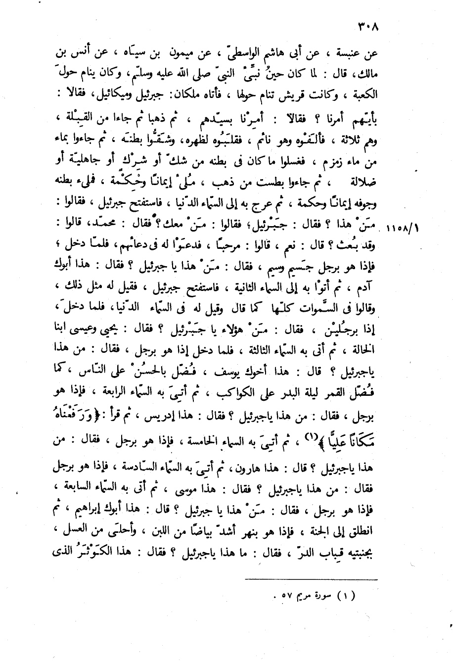 وَقَدْ بُعِثَ؟ قَالَ: نَعَمْ، قَالُوا: مَرْحَبًا، فَدَعَوْا لَهُ فِي دُعَائِهِمْ، فَلَمَّا دَخَلَ، فَإِذَا هُوَ بِرَجُلٍ جسيم وسيم، فقال: من هذا يا جبرئيل؟ فَقَالَ: هَذَا أَبُوكَ آدَمُ، ثُمَّ أَتَوْا بِهِ الى السماء الثانيه، فاستفتح جبرئيل، فَقِيلَ لَهُ مِثْلُ ذَلِكَ، وَقَالُوا فِي السَّمَوَاتِ كُلِّهَا كَمَا قَالَ وَقِيلَ لَهُ فِي السَّمَاءِ الدُّنْيَا، فَلَمَّا دَخَلَ، إِذَا بِرَجُلَيْنِ، فَقَالَ: مَنْ هؤلاء يا جبرئيل؟ فَقَالَ: يَحْيَى وَعِيسَى ابْنَا الْخَالَةِ، ثُمَّ أُتِيَ بِهِ السَّمَاءَ الثَّالِثَةَ، فَلَمَّا دَخَلَ إِذَا هُوَ برجل، فقال: من هذا يا جبرئيل؟ قَالَ: هَذَا أَخُوكَ يُوسُفُ، فُضِّلَ بِالْحُسْنِ عَلَى النَّاسِ، كَمَا فُضِّلَ الْقَمَرُ لَيْلَةَ الْبَدْرِ عَلَى الْكَوَاكِبِ، ثُمَّ أُتِيَ بِهِ السَّمَاءَ الرَّابِعَةَ، فَإِذَا هو برجل، فقال: من هذا يا جبرئيل؟ فَقَالَ: هَذَا إِدْرِيسُ، ثُمَّ قَرَأَ: «وَرَفَعْناهُ مَكاناً عَلِيًّا» ، ثُمَّ أُتِيَ بِهِ السَّمَاءَ الْخَامِسَةَ، فَإِذَا هُوَ برجل، فقال: من هذا يا جبرئيل؟ قَالَ: هَذَا هَارُونُ، ثُمَّ أُتِيَ بِهِ السَّمَاءَ السَّادِسَةَ، فَإِذَا هُوَ بِرَجُلٍ فَقَالَ: مَنْ هَذَا يا جبرئيل؟ فَقَالَ: هَذَا موسى، ثُمَّ أُتِيَ بِهِ السَّمَاءَ السَّابِعَةَ، فَإِذَا هُوَ بِرَجُلٍ، فَقَالَ: مَنْ هَذَا يا جبرئيل؟ قَالَ: هَذَا أَبُوكَ إِبْرَاهِيمُ، ثُمَّ انْطَلَقَ إِلَى الْجَنَّةِ، فَإِذَا هُوَ بِنَهْرٍ أَشَدَّ بَيَاضًا مِنَ اللَّبَنِ، وَأَحْلَى مِنَ الْعَسَلِ، بِجَنْبَتَيْهِ قِبَابُ الدُّرِّ، فقال: ما هذا يا جبرئيل؟ فَقَالَ: هَذَا الْكَوْثَرُ الَّذِي