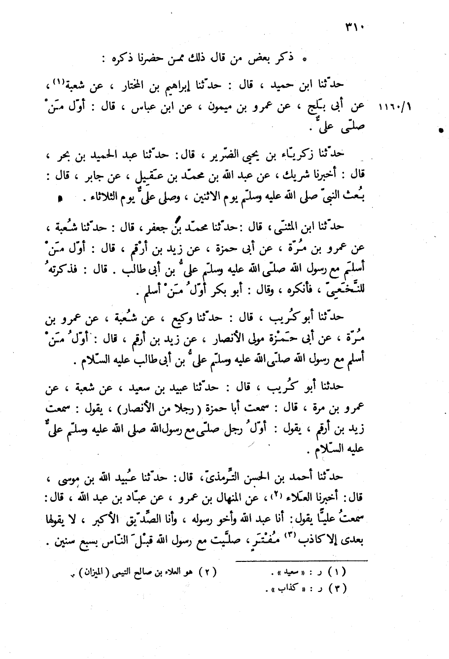 حَدَّثَنَا أَبُو كُرَيْبٍ، قَالَ: حَدَّثَنَا عُبَيْدُ بْنُ سَعِيدٍ، عَنْ شُعْبَةَ، عَنْ عَمْرِو بْنِ مُرَّةَ، قَالَ: سَمِعْتُ أبا حمزه جلا مِنَ الأَنْصَارِ، يَقُولُ: سَمِعْتُ زَيْدَ بْنَ أَرْقَمَ، يَقُولُ: أَوَّلُ رَجُلٍ صَلَّى مَعَ رَسُولِ اللَّهِ ص على ع.