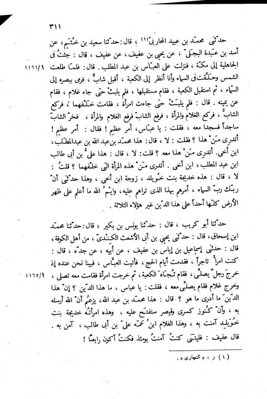 حَدَّثَنِي مُحَمَّدُ بْنُ عُبَيْدٍ الْمُحَارِبِيُّ، قَالَ: حَدَّثَنَا سَعِيدُ بْنُ خُثَيْمٍ، عَنْ أَسَدِ بْنِ عَبْدَةَ الْبَجَلِيِّ، عَنْ يَحْيَى بْنِ عَفِيفٍ، عَنْ عَفِيفٍ، قَالَ: جِئْتُ فِي الْجَاهِلِيَّةِ إِلَى مَكَّةَ، فَنَزَلْتُ عَلَى الْعَبَّاسِ بْنِ عَبْدِ الْمُطَّلِبِ قَالَ: فَلَمَّا طَلَعَتِ الشَّمْسُ وَحَلَّقَتْ فِي السَّمَاءِ وَأَنَا أَنْظُرُ إِلَى الْكَعْبَةِ، أَقْبَلَ شَابٌّ، فَرَمَى بِبَصَرِهِ إِلَى السَّمَاءِ، ثُمَّ اسْتَقْبَلَ الْكَعْبَةَ، فَقَامَ مُسْتَقْبِلَهَا، فَلَمْ يَلْبَثْ حَتَّى جَاءَ غُلامٌ، فَقَامَ عَنْ يَمِينِهِ قَالَ: فَلَمْ يَلْبَثْ حَتَّى جَاءَتِ امْرَأَةٌ، فَقَامَتْ خَلْفَهُمَا، فَرَكَعَ الشَّابُّ، فَرَكَعَ الْغُلامُ وَالْمَرْأَةُ، فَرَفَعَ الشَّابُّ فَرَفَعَ الْغُلامُ وَالْمَرْأَةُ، فَخَرَّ الشَّابُّ سَاجِدًا فَسَجَدَا مَعَهُ، فَقُلْتُ: يَا عَبَّاسُ، أَمْرٌ عَظِيمٌ! فَقَالَ: أَمْرٌ عَظِيمٌ! أَتَدْرِي مَنْ هَذَا؟ فَقُلْتُ: لا، قَالَ: هَذَا مُحَمَّدُ بْنُ عَبْدِ اللَّهِ بْنِ عَبْدِ الْمُطَّلِبِ، ابْنُ أَخِي أَتَدْرِي مَنْ هَذَا مَعَهُ؟ قُلْتُ: لا، قَالَ: هَذَا عَلِيُّ بن ابى طالب ابن عَبْدِ الْمُطَّلِبِ، ابْنُ أَخِي أَتَدْرِي مَنْ هَذِهِ الْمَرْأَةُ الَّتِي خَلْفَهُمَا؟ قُلْتُ: