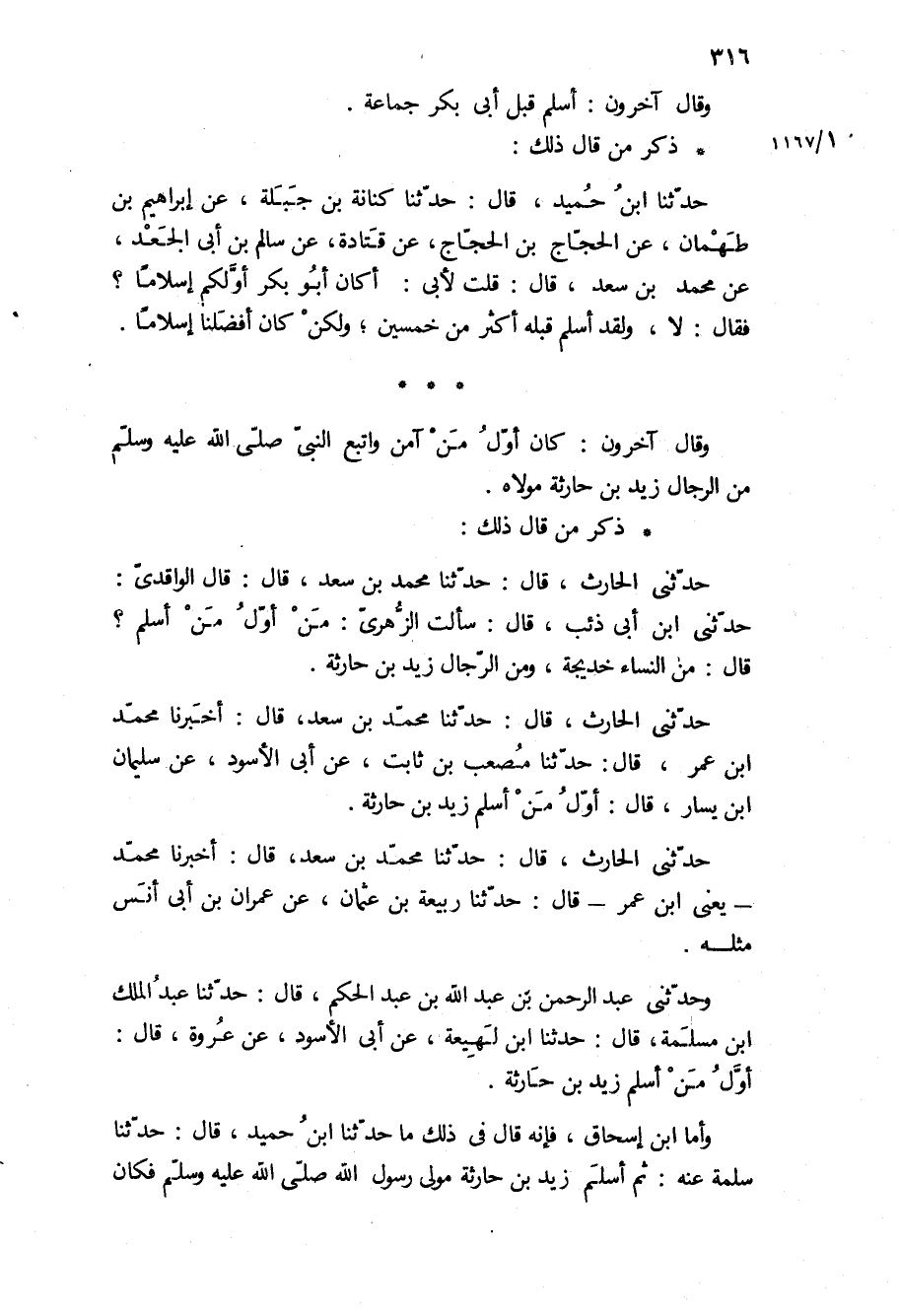 حدثني الحارث، قال: حدثنا مُحَمَّد بن سعد، قال: أخبرنا محمد ابن عمر، قال: حدثنا مصعب بن ثابت، عن ابى الأسود، عن سليمان ابن يسار، قال: أول من أسلم زيد بن حارثة.