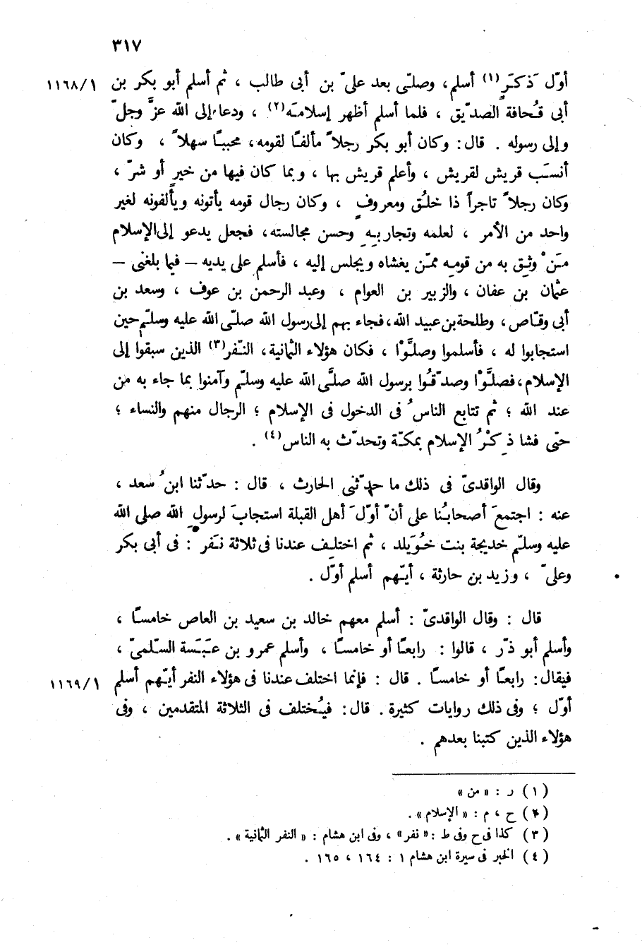 قَالَ: وَقَالَ الواقدي: أَسْلَمَ مَعَهُمْ خَالِدُ بْنُ سَعِيدِ بْنِ الْعَاصِ خَامِسًا، وَأَسْلَمَ أَبُو ذَرٍّ، قَالُوا: رَابِعًا أَوْ خَامِسًا، وَأَسْلَمَ عَمْرُو بْنُ عَبْسَةَ السُّلَمِيُّ، فَيُقَالُ: رَابِعًا أَوْ خَامِسًا قَالَ: فَإِنَّمَا اخْتُلِفَ عِنْدَنَا فِي هَؤُلاءِ النَّفَرِ أَيُّهُمْ أَسْلَمَ أَوَّلَ، وَفِي ذَلِكَ رِوَايَاتٌ كَثِيرَةٌ قَالَ: فَيُخْتَلَفُ فِي الثَّلاثَةِ الْمُتَقَدِّمِينَ، وَفِي هَؤُلاءِ الَّذِينَ كَتَبْنَا بَعْدَهُمْ
