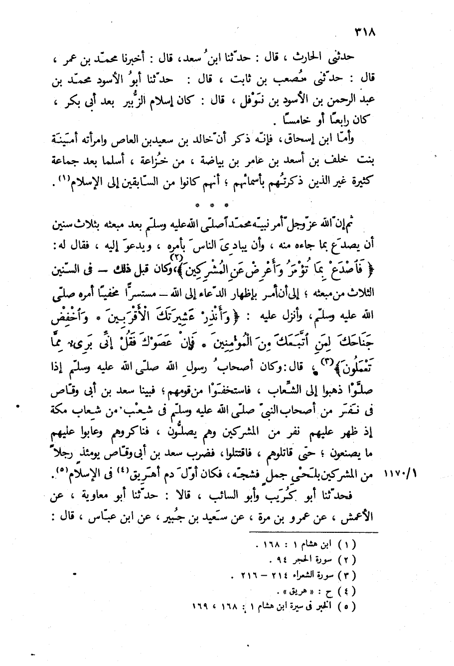 «فَاصْدَعْ بِما تُؤْمَرُ وَأَعْرِضْ عَنِ الْمُشْرِكِينَ» ، وَكَانَ قَبْلَ ذَلِكَ- فِي السِّنِينَ الثَّلاثِ مِنْ مَبْعَثِهِ، إِلَى أَنْ أُمِرَ بِإِظْهَارِ الدُّعَاءِ إِلَى الله- مستسرا مخفيا امره ص، وَأُنْزِلَ عَلَيْهِ: «وَأَنْذِرْ عَشِيرَتَكَ الْأَقْرَبِينَ وَاخْفِضْ جَناحَكَ لِمَنِ اتَّبَعَكَ مِنَ الْمُؤْمِنِينَ فَإِنْ عَصَوْكَ فَقُلْ إِنِّي بَرِيءٌ مِمَّا تَعْمَلُونَ» ، قال: وكان اصحاب رسول الله ص إِذَا صَلَّوْا ذَهَبُوا إِلَى الشِّعَابِ، فَاسْتَخْفَوْا مِنْ قَوْمِهِمْ، فَبَيْنَا سَعْدُ بْنُ أَبِي وَقَّاصٍ فِي نفر من اصحاب النبي ص فِي شِعْبٍ مِنْ شِعَابِ مَكَّةَ إِذْ ظَهَرَ عَلَيْهِمْ نَفَرٌ مِنَ الْمُشْرِكِينَ وَهُمْ يُصَلُّونَ، فَنَاكَرُوهُمْ وَعَابُوا عَلَيْهِمْ مَا يَصْنَعُونَ، حَتَّى قَاتَلُوهُمْ، فَاقْتَتَلُوا، فَضَرَبَ سَعْدُ بْنُ أَبِي وَقَّاصٍ يَوْمَئِذٍ رَجُلا مِنَ الْمُشْرِكِينَ بِلَحْيِ جَمَلٍ فَشَجَّهُ، فَكَانَ أَوَّلَ دَمٍ أُهْرِيقَ فِي الإِسْلامِ.