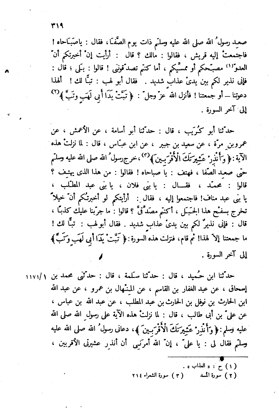 حَدَّثَنَا أَبُو كُرَيْبٍ، قَالَ: حَدَّثَنَا أَبُو أُسَامَةَ، عَنِ الأَعْمَشِ، عَنْ عَمْرِو بْنِ مُرَّةَ، عَنْ سَعِيدِ بْنِ جُبَيْرٍ، عَنِ ابْنِ عَبَّاسٍ، [قَالَ: لَمَّا نَزَلَتْ هَذِهِ الآيَةُ: «وَأَنْذِرْ عَشِيرَتَكَ الْأَقْرَبِينَ» ، خرج رسول الله ص حَتَّى صَعِدَ الصَّفَا، فَهَتَفَ: يَا صَبَاحَاهْ! فَقَالُوا: مَنْ هَذَا الَّذِي يَهْتِفُ؟
