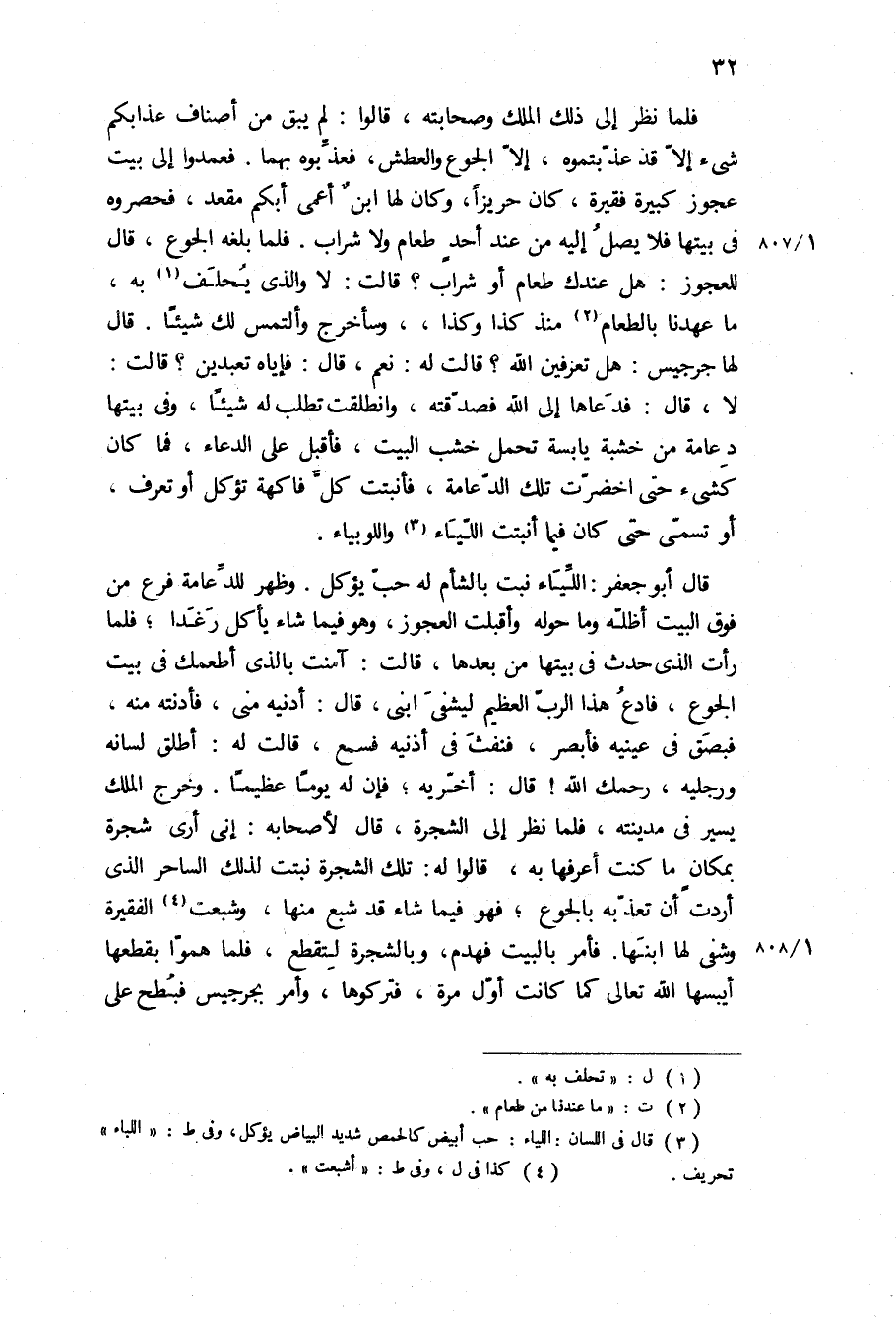 قال ابو جعفر: اللياء نبت بالشام له حب يؤكل وظهر للدعامة فرع من فوق البيت أظله وما حوله وأقبلت العجوز، وهو فيما شاء يأكل رغدا، فلما رأت الذي حدث في بيتها من بعدها، قالت: آمنت بالذي أطعمك في بيت الجوع، فادع هذا الرب العظيم ليشفي ابني، قَالَ: أدنيه مني، فأدنته منه، فبصق في عينيه فأبصر، فنفث في أذنيه فسمع، قالت له: أطلق لسانه ورجليه، رحمك الله! قَالَ: أخريه، فإن له يوما عظيما وخرج الملك يسير في مدينته، فلما نظر إلى الشجرة، قَالَ لأصحابه: إني أرى شجرة بمكان ما كنت أعرفها به، قَالُوا له: تلك الشجرة نبتت لذلك الساحر الذي أردت أن تعذبه بالجوع، فهو فيما شاء قد شبع منها، وشبعت الفقيرة وشفى لها ابنها فأمر بالبيت فهدم، وبالشجرة لتقطع، فلما هموا بقطعها أيبسها الله تعالى كما كانت أول مرة، فتركوها، وأمر بجرجيس فبطح على
