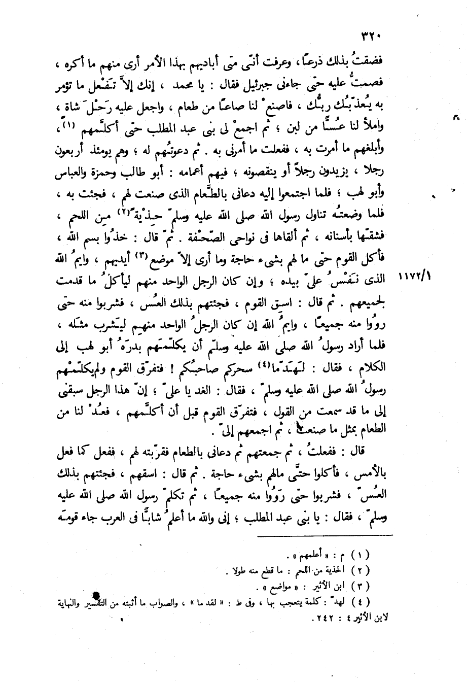 فَضِقْتُ بِذَلِكَ ذَرْعًا، وَعَرَفْتُ أَنِّي مَتَى أُبَادِيهِمْ بِهَذَا الأَمْرِ أَرَى مِنْهُمْ مَا أَكْرَهُ، فَصَمَتُّ عليه حتى جاءني جبرئيل فَقَالَ: يَا مُحَمَّدُ، إِنَّكَ إِلا تَفْعَلْ مَا تُؤْمَرُ بِهِ يُعَذِّبْكَ رَبُّكَ، فَاصْنَعْ لَنَا صَاعًا من طعام، واجعل عليه رحل شَاةٍ، وَامْلأْ لَنَا عُسًّا مِنْ لَبَنٍ، ثُمَّ اجْمَعْ لِي بَنِي عَبْدِ الْمُطَّلِبِ حَتَّى أُكَلِّمَهُمْ، وَأُبَلِّغَهُمْ مَا أُمِرْتُ بِهِ، فَفَعَلْتُ مَا أَمَرَنِي بِهِ ثُمَّ دَعَوْتُهُمْ لَهُ، وَهُمْ يَوْمَئِذٍ أَرْبَعُونَ رَجُلا، يَزِيدُونَ رَجُلا أَوْ يَنْقُصُونَهُ، فِيهِمْ أَعْمَامُهُ: أَبُو طَالِبٍ وَحَمْزَةُ وَالْعَبَّاسُ وَأَبُو لَهَبٍ، فَلَمَّا اجْتَمَعُوا إِلَيْهِ دَعَانِي بِالطَّعَامِ الَّذِي صَنَعْتُ لَهُمْ، فَجِئْتُ بِهِ، فَلَمَّا وَضَعْتُهُ تَنَاوَلَ رَسُولُ اللَّهِ ص حِذْيَةً مِنَ اللَّحْمِ، فَشَقَّهَا بِأَسْنَانِهِ، ثُمَّ أَلْقَاهَا فِي نَوَاحِي الصَّحْفَةِ ثُمَّ قَالَ: خُذُوا بِسْمِ اللَّهِ، فَأَكَلَ الْقَوْمُ حَتَّى مَا لَهُمْ بِشَيْءٍ حَاجَةٌ وَمَا أَرَى إِلا مَوْضِعَ أَيْدِيهِمْ، وَايْمُ اللَّهِ الَّذِي نَفْسُ عَلِيٍّ بِيَدِهِ، وَإِنْ كَانَ الرَّجُلُ الْوَاحِدُ مِنْهُمْ لَيَأْكُلُ مَا قَدَّمْتُ لِجَمِيعِهِمْ ثُمَّ قَالَ: اسْقِ الْقَوْمَ، فَجِئْتُهُمْ بِذَلِكَ الْعُسِّ، فَشَرِبُوا مِنْهُ حَتَّى رُوُوا مِنْهُ جَمِيعًا، وَايْمُ اللَّهِ إِنْ كَانَ الرَّجُلُ الْوَاحِدُ مِنْهُمْ لَيَشْرَبُ مثله، فلما اراد رسول الله ص أَنْ يُكَلِّمَهُمْ بَدَرَهُ أَبُو لَهَبٍ إِلَى الْكَلامِ، فقال: لهدما سَحَرَكُمْ صَاحِبُكُمْ! فَتَفَرَّقَ الْقَوْمُ وَلَمْ يُكَلِّمْهُمْ رَسُولُ الله ص، فَقَالَ: الْغَدَ يَا عَلِيُّ، إِنَّ هَذَا الرَّجُلَ سَبَقَنِي إِلَى مَا قَدْ سَمِعْتَ مِنَ الْقَوْلِ، فَتَفَرَّقَ الْقَوْمُ قَبْلَ أَنْ أُكَلِّمَهُمْ، فَعُدَّ لَنَا مِنَ الطَّعَامِ بِمِثْلِ مَا صَنَعْتَ، ثُمَّ اجْمَعْهُمْ إِلَيَّ.