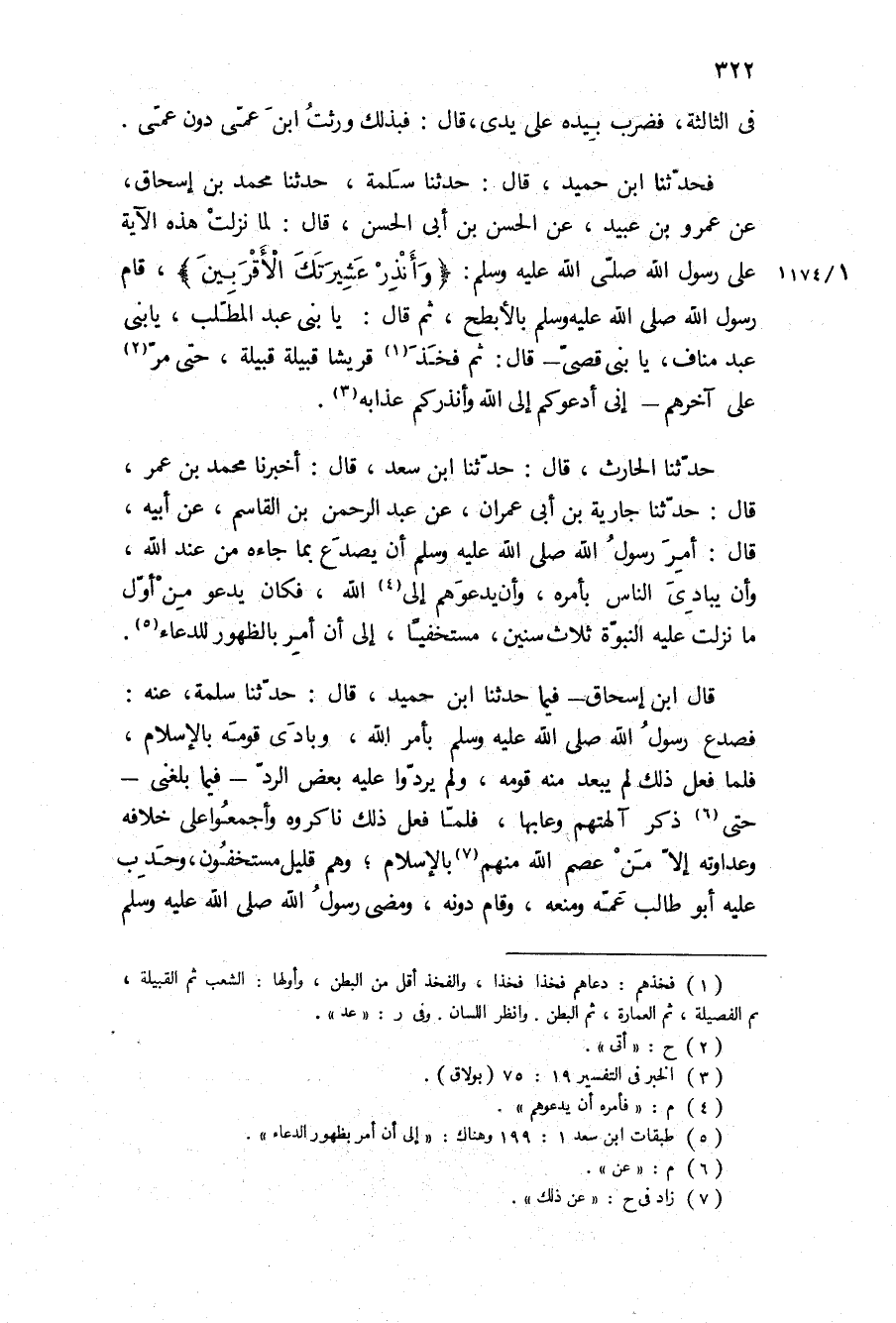 فَحَدَّثَنَا ابْنُ حُمَيْدٍ، قَالَ: حَدَّثَنَا سَلَمَةُ، حَدَّثَنَا مُحَمَّدُ بْنُ إِسْحَاقَ، عَنْ عَمْرِو بْنِ عُبَيْدٍ، عَنِ الْحَسَنِ بْنِ أَبِي الْحَسَنِ، قَالَ: لَمَّا نَزَلَتْ هذه الآية على رسول الله ص: «وَأَنْذِرْ عَشِيرَتَكَ الْأَقْرَبِينَ» ، قام رسول الله ص بِالأَبْطَحِ، [ثُمَّ قَالَ: يَا بَنِي عَبْدِ الْمُطَّلِبِ، يَا بَنِي عَبْدِ مَنَافٍ، يَا بَنِي قُصَيٍّ- قَالَ: ثُمَّ فَخَّذَ قُرَيْشًا قَبِيلَةً قَبِيلَةً، حَتَّى مَرَّ عَلَى آخِرِهِمْ- إِنِّي أَدْعُوكُمْ إِلَى اللَّهِ وانذركم عذابه] .