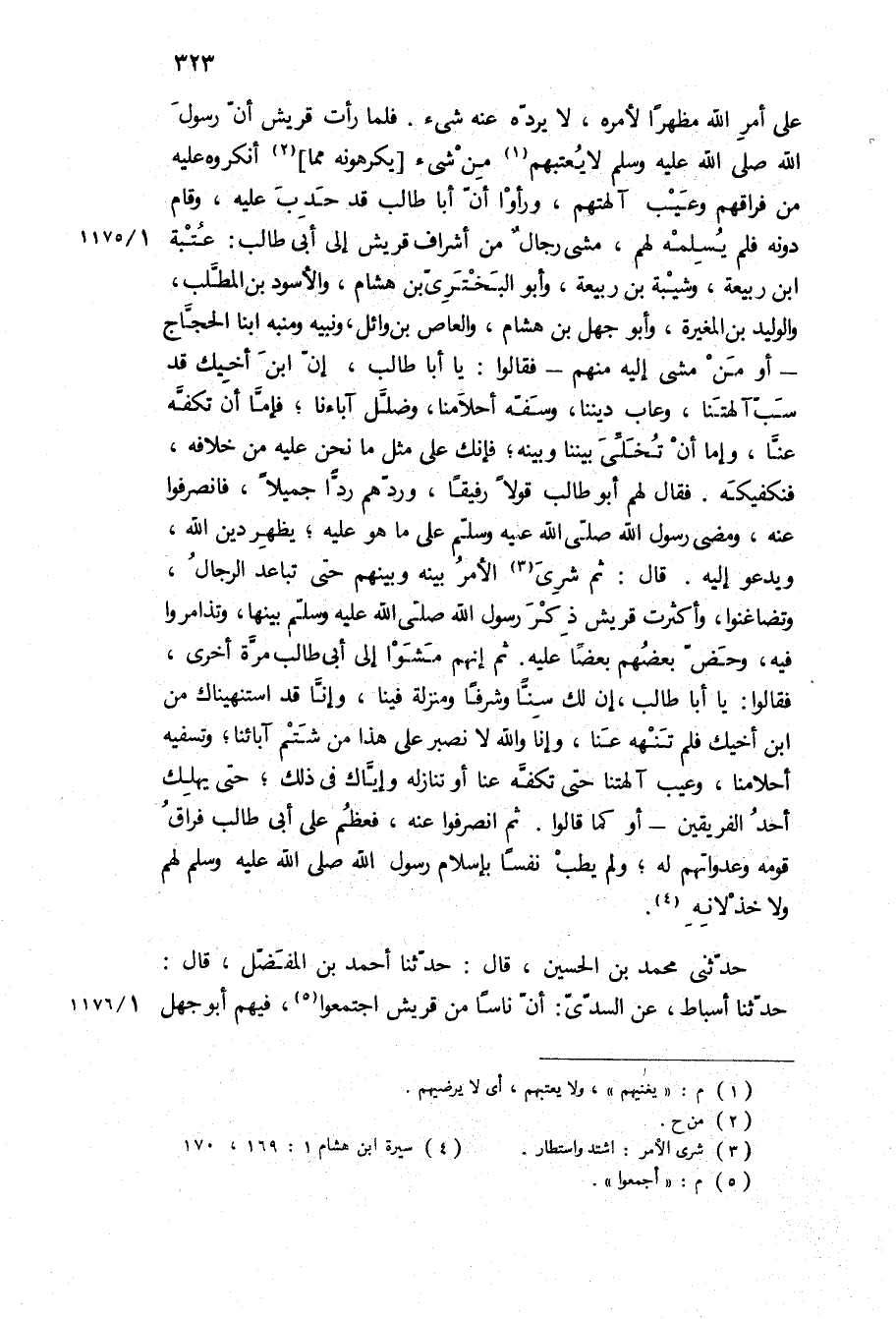 عَلَى أَمْرِ اللَّهِ مُظْهِرًا لأَمْرِهِ، لا يَرُدُّهُ عَنْهُ شَيْءٌ فَلَمَّا رَأَتْ قُرَيْشٌ أَنَّ رَسُولَ الله ص لا يعتبهم من شيء يكرهونه مما أَنْكَرُوهُ عَلَيْهِ مِنْ فِرَاقِهِمْ وَعَيْبِ آلِهَتِهِمْ، وَرَأَوْا أَنَّ أَبَا طَالِبٍ قَدْ حَدَبَ عَلَيْهِ، وَقَامَ دُونَهُ فَلَمْ يُسَلِّمْهُ لَهُمْ، مَشَى رِجَالٌ مِنْ اشراف قريش الى ابى طالب: عتبة ابن رَبِيعَةَ، وَشَيْبَةُ بْنُ رَبِيعَةَ، وَأَبُو الْبَخْتَرِيِّ بْنُ هِشَامٍ، وَالأَسْوَدُ بْنُ الْمُطَّلِبِ، وَالْوَلِيدُ بْنُ الْمُغِيرَةِ، وَأَبُو جَهْلِ بْنُ هِشَامٍ، وَالْعَاصُ بْنُ وَائِلٍ، وَنَبِيهٌ وَمُنَبِّهٌ ابْنَا الْحَجَّاجِ- أَوْ مَنْ مَشَى إِلَيْهِ مِنْهُمْ- فَقَالُوا: يَا أَبَا طَالِبٍ، إِنَّ ابْنَ أَخِيكَ قَدْ سَبَّ آلِهَتَنَا، وَعَابَ دِينَنَا، وَسَفَّهَ أَحْلَامَنَا، وَضَلَّلَ آبَاءَنَا، فَإِمَّا أَنْ تَكُفَّهُ عَنَّا، وَإِمَّا أَنْ تُخَلِّيَ بَيْنَنَا وَبَيْنَهُ، فَإِنَّكَ عَلَى مِثْلِ مَا نَحْنُ عَلَيْهِ مِنْ خِلَافِهِ، فَنُكْفِيكَهُ فَقَالَ لَهُمْ أَبُو طَالِبٍ قَوْلًا رَفِيقًا، وَرَدَّهُمْ رَدًّا جَمِيلًا، فَانْصَرَفُوا عَنْهُ، وَمَضَى رَسُولُ الله ص عَلَى مَا هُوَ عَلَيْهِ، يُظْهِرُ دِينَ اللَّهِ، وَيَدْعُو إِلَيْهِ قَالَ: ثُمَّ شَرِيَ الأَمْرُ بَيْنَهُ وَبَيْنَهُمْ حَتَّى تَبَاعَدَ الرِّجَالُ، وَتَضَاغَنُوا، وَأَكْثَرَتْ قُرَيْشٌ ذكر رسول الله ص بَيْنَهَا، وَتَذَامَرُوا فِيهِ، وَحَضَّ بَعْضُهُمْ بَعْضًا عَلَيْهِ ثُمَّ إِنَّهُمْ مَشَوْا إِلَى أَبِي طَالِبٍ مَرَّةً أُخْرَى، فَقَالُوا: يَا أَبَا طَالِبٍ، إِنَّ لَكَ سِنًّا وَشَرَفًا وَمَنْزِلَةً فِينَا، وَإِنَّا قَدِ اسْتَنْهَيْنَاكَ مِنَ ابْنِ أَخِيكَ فَلَمْ تَنْهَهْ عَنَّا، وَإِنَّا وَاللَّهِ لا نَصْبِرُ عَلَى هَذَا مِنْ شَتْمِ آبَائِنَا، وَتَسْفِيهِ أَحْلَامِنَا، وَعَيْبِ آلِهَتِنَا حَتَّى تَكُفَّهُ عنا او تنازله وَإِيَّاكَ فِي ذَلِكَ، حَتَّى يَهْلِكَ أَحَدُ الْفَرِيقَيْنِ- أَوْ كَمَا قَالُوا ثُمَّ انْصَرَفُوا عَنْهُ، فَعَظُمَ على ابى طالب فراق قومه وعدواتهم لَهُ، وَلَمْ يَطِبْ نَفْسًا بِإِسْلَامِ رَسُولِ اللَّهِ ص لهم ولا خذلانه.