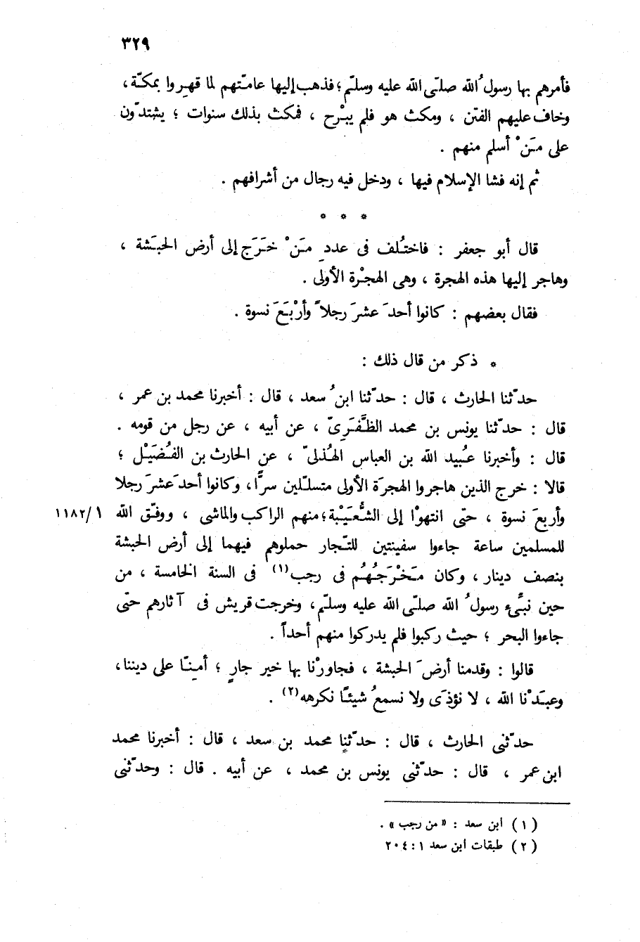 قَالَ أَبُو جَعْفَرٍ: فَاخْتُلِفَ فِي عَدَدِ مَنْ خَرَجَ إِلَى أَرْضِ الْحَبَشَةِ، وَهَاجَرَ إِلَيْهَا هَذِهِ الْهِجْرَةَ، وَهِيَ الْهِجْرَةُ الأُولَى.