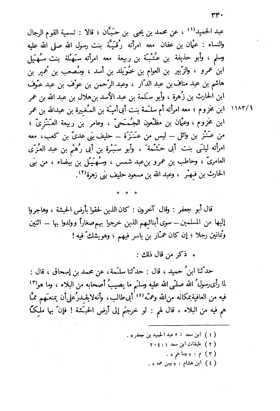 عبد الحميد، عن محمد بن يحيى بن حبان، قالا: تسمية القوم الرجال والنساء: عثمان بن عفان معه امرأته رقية بنت رسول الله ص، وأبو حذيفة بن عتبة بن ربيعة معه امراته سهله بنت سهيل ابن عمرو، والزبير بن العوام بن خويلد بن أسد، ومصعب بن عمير بْنِ هَاشِمِ بْنِ عَبْدِ مَنَافِ بْنِ عَبْدِ الدار، وعبد الرحمن بن عوف بن عبد عوف ابن الحارث بن زهرة، وأبو سلمة بْن عبد الأسد بْن هلال بْن عبد الله بن عمر ابن مخزوم، معه امرأته أم سلمة بنت أبي أمية بْن المغيرة بْن عبد الله بْن عمر ابن مخزوم، وعثمان بن مظعون الجمحي، وعامر بن ربيعة العنزي، من عنز بن وائل- ليس من عنزة- حليف بني عدي بن كعب، معه امرأته ليلى بنت أبي حثمة، وأبو سبرة بْن أبي رهم بْن عبد العزى العامري، وحاطب بن عمرو بن عبد شمس، وسهيل بن بيضاء، من بني الحارث بن فهر، وعبد الله بن مسعود حليف بني زهرة قال أبو جعفر: وقال آخرون: كان الذين لحقوا بأرض الحبشة، وهاجروا إليها من المسلمين- سوى أبنائهم الذين خرجوا بهم صغارا وولدوا بها- اثنين وثمانين رجلا، إن كان عمار بن ياسر فيهم، وهو يشك فيه! ذكر من قال ذلك:
