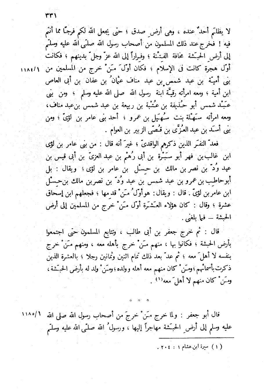 لَا يُظْلَمُ أَحَدٌ عِنْدَهُ، وَهِيَ أَرْضُ صِدْقٍ، حَتَّى يَجْعَلَ اللَّهُ لَكُمْ فَرَجًا مِمَّا أَنْتُمْ فِيهِ!] فَخَرَجَ عِنْدَ ذَلِكَ الْمُسْلِمُونَ مِنْ أَصْحَابِ رسول الله صَلَّى اللَّهُ عَلَيْهِ وَسَلَّمَ إلى أَرْضِ الْحَبَشَةِ مَخَافَةَ الْفِتْنَةِ، وَفِرَارًا إِلَّى اللَّهِ عَزَّ وَجَلَّ بِدِينِهِمْ، فَكَانَتْ أَوَّلَ هِجْرَةٍ كَانَتْ فِي الإِسْلَامِ، فَكَانَ أَوَّلَ مَنْ خَرَجَ مِنَ الْمُسْلِمِينَ مِنْ بَنِي أُمَيَّةَ بْنِ عَبْدِ شَمْسِ بْنِ عَبْدِ مَنَافٍ عُثْمَانُ بْنُ عَفَّانَ بْنِ ابى العاص ابن أُمَيَّةَ، وَمَعَهُ امْرَأَتُهُ رُقَيَّةُ ابْنَةُ رَسُولِ اللَّهِ ص، وَمِنْ بَنِي عَبْدِ شَمْسٍ أَبُو حُذَيْفَةَ بْنُ عُتْبَةَ بْنِ رَبِيعَةَ بْنِ عَبْدِ شَمْسِ بْنِ عَبْدِ مَنَافٍ، وَمَعَهُ امْرَأَتُهُ سَهْلَةُ بِنْتُ سُهَيْلِ بْنِ عَمْرٍو، أَحَدِ بَنِي عَامِرِ بْنِ لُؤَيٍّ، وَمِنْ بَنِي أَسَدِ بْنِ عَبْدِ الْعُزَّى بْنِ قُصَيٍّ الزُّبَيْرُ بْنُ الْعَوَّامِ.