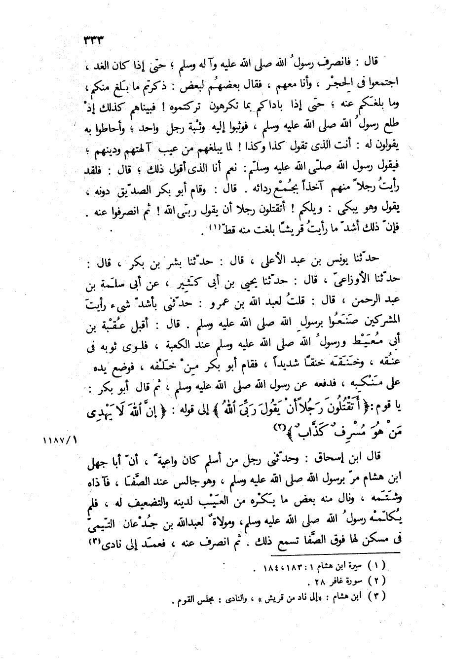 يَا قَوْمُ: «أَتَقْتُلُونَ رَجُلًا أَنْ يَقُولَ رَبِّيَ اللَّهُ» إِلَى قَوْلِهِ: «إِنَّ اللَّهَ لا يَهْدِي مَنْ هُوَ مُسْرِفٌ كَذَّابٌ» قال ابن إسحاق: وحدثني رجل من أسلم كان واعيه، ان أبا جهل ابن هشام مر برسول الله ص، وهو جالس عند الصفا، فآذاه وشتمه، ونال منه بعض ما يكره من العيب لدينه والتضعيف له، فلم يكلمه رسول الله ص، ومولاة لعبد الله بن جدعان التيمي في مسكن لها فوق الصفا تسمع ذلك ثم انصرف عنه، فعمد إلى نادي