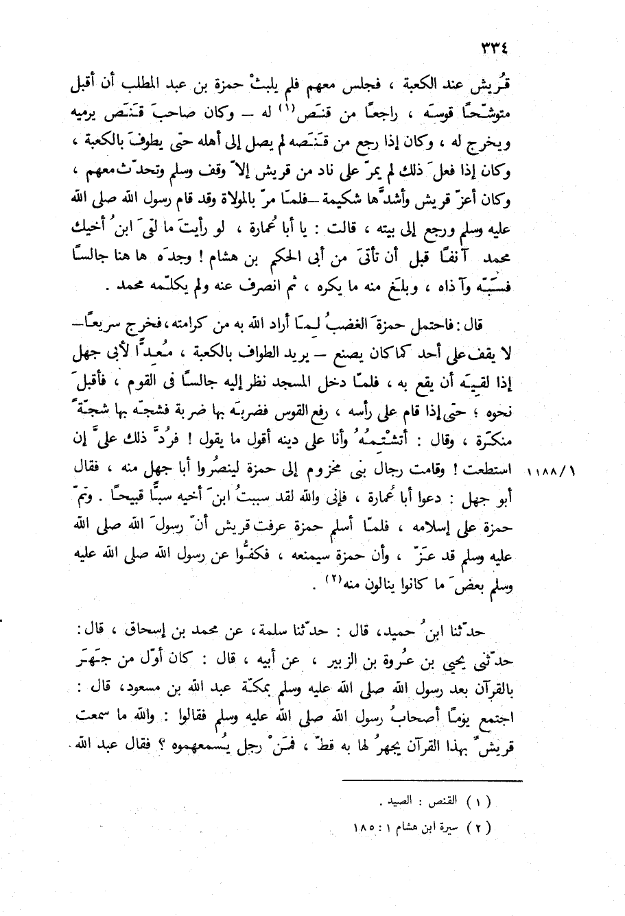 قريش عند الكعبة، فجلس معهم فلم يلبث حمزة بن عبد المطلب أن أقبل متوشحا قوسه، راجعا من قنص له- وكان صاحب قنص يرميه ويخرج له، وكان إذا رجع من قنصه لم يصل إلى أهله حتى يطوف بالكعبة، وكان إذا فعل ذلك لم يمر على ناد من قريش إلا وقف وسلم وتحدث معهم، وكان أعز قريش وأشدها شكيمة- فلما مر بالمولاة وقد قام رسول الله ص ورجع الى بيته، قالت: يا أبا عمارة، لو رأيت ما لقي ابن أخيك محمد آنفا قبل أن تأتي من ابى الحكم بن هشام! وجده هاهنا جالسا فسبه وآذاه، وبلغ منه ما يكره، ثم انصرف عنه ولم يكلمه محمد.