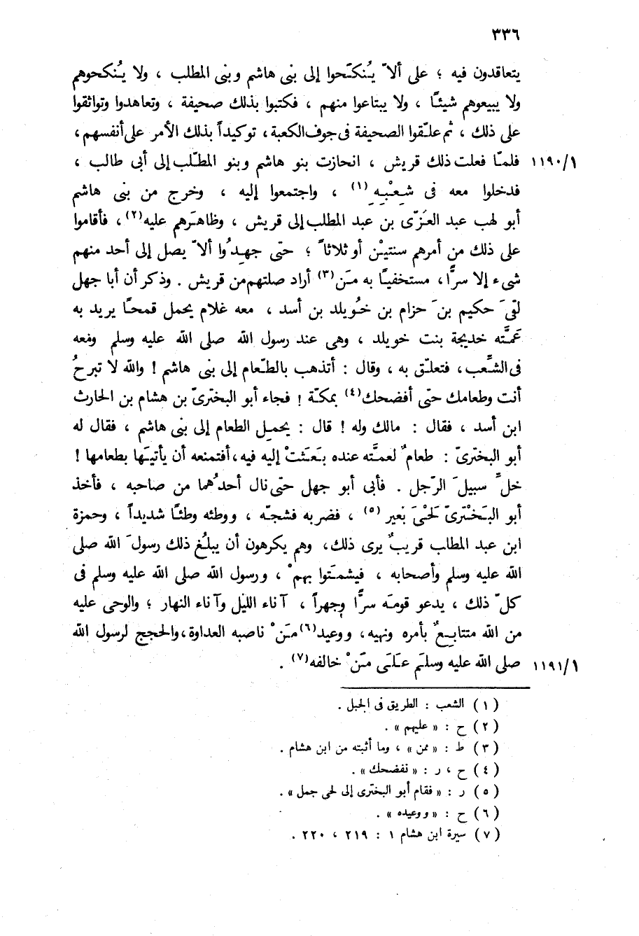 يتعاقدون فيه، على الا ينكحوا إلى بني هاشم وبني المطلب، ولا ينكحوهم ولا يبيعوهم شيئا، ولا يبتاعوا منهم، فكتبوا بذلك صحيفة، وتعاهدوا وتواثقوا على ذلك، ثم علقوا الصحيفة في جوف الكعبة، توكيدا بذلك الأمر على أنفسهم، فلما فعلت ذلك قريش، انحازت بنو هاشم وبنو المطلب إلى أبي طالب، فدخلوا معه في شعبه، واجتمعوا إليه، وخرج من بني هاشم أبو لهب عبد العزى بن عبد المطلب إلى قريش، وظاهرهم عليه، فأقاموا على ذلك من أمرهم سنتين أو ثلاثا، حتى جهدوا ألا يصل إلى أحد منهم شيء إلا سرا، مستخفيا به من أراد صلتهم من قريش وذكر أن أبا جهل لقي حكيم بن حزام بن خويلد بن أسد، معه غلام يحمل قمحا يريد به عمته خديجة بنت خويلد، وهي عند رسول الله ص ومعه في الشعب، فتعلق به، وقال: أتذهب بالطعام إلى بني هاشم! والله لا تبرح أنت وطعامك حتى أفضحك بمكة! فجاء أبو البختري بن هشام بن الحارث ابن اسد، فقال: مالك وله! قال: يحمل الطعام إلى بني هاشم، فقال له أبو البختري: طعام لعمته عنده بعثت اليه فيه، أفتمنعه أن يأتيها بطعامها! خل سبيل الرجل فأبى أبو جهل حتى نال أحدهما من صاحبه، فأخذ أبو البختري لحي بعير، فضربه فشجه، ووطئه وطئا شديدا، وحمزه ابن عبد المطلب قريب يرى ذلك، وهم يكرهون ان يبلغ ذلك رسول الله ص واصحابه، فيشمتوا بهم، ورسول الله ص في كل ذلك، يدعو قومه سرا وجهرا، آناء الليل وآناء النهار، والوحي عليه من الله متتابع بأمره ونهيه، ووعيد من ناصبه العداوة، والحجج لرسول الله ص على من خالفه