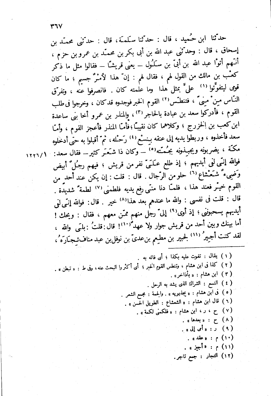 حَدَّثَنَا ابْنُ حُمَيْدٍ، قَالَ: حَدَّثَنَا سَلَمَةُ، قال: حدثني محمد بن إسحاق، قَالَ: وحدثني عَبْدُ اللَّهِ بْنُ أَبِي بَكْرِ بن مُحَمَّد بن عمرو بن حزم، أنهم أتوا عبد الله بن ابى بن سلون- يعني قريشا- فقالوا مثل ما ذكر كعب بن مالك من القول لهم، فقال لهم: إن هذا لأمر جسيم، ما كان قومي ليتفوتوا علي بمثل هذا وما علمته كان فانصرفوا عنه، وتفرق الناس من منى، فتنطس القوم الخبر فوجدوه قد كان، وخرجوا في طلب القوم، فأدركوا سعد بن عبادة بالحاجر، والمنذر بن عمرو أخا بنى ساعده ابن كعب بن الخزرج، وكلاهما كان نقيبا، فأما المنذر فأعجز القوم، وأما سعد فأخذوه، وربطوا يديه إلى عنقه بنسع رحله، ثم أقبلوا به حتى أدخلوه مكة، يضربونه ويجبذونه بجمته- وكان ذا شعر كثير- فقال سعد: