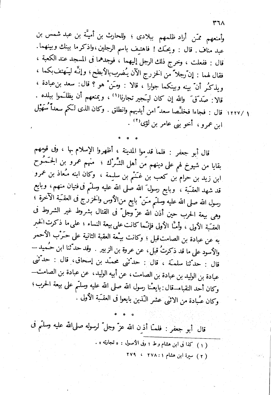 قال أبو جعفر: فلما قدموا المدينة، أظهروا الإسلام بها، وفي قومهم بقايا من شيوخ لهم على دينهم من أهل الشرك، منهم عمرو بن الجموح ابن زيد بن حرام بن كعب بن غنم بن سلمة، وكان ابنه معاذ بن عمرو قد شهد العقبه، وبايع رسول الله ص في فتيان منهم، وبايع رسول الله ص من بايع من الأوس والخزرج في العقبة الآخرة، وهي بيعة الحرب حين أذن الله عز وجل في القتال بشروط غير الشروط في العقبة الأولى، وأما الأولى فإنما كانت على بيعة النساء، على ما ذكرت الخبر به عن عبادة بن الصامت قبل، وكانت بيعة العقبة الثانية على حرب الأحمر والأسود على ما قد ذكرت قبل، عن عروة بن الزبير وَقَدْ حَدَّثَنَا ابْنُ حُمَيْدٍ- قَالَ: حَدَّثَنَا سلمة، قال: حدثني محمد بن إسحاق، قَالَ: حَدَّثَنِي عُبَادَةُ بْنُ الْوَلِيدِ بْنِ عُبَادَةَ بْنِ الصَّامِتِ، عَنْ أَبِيهِ الْوَلِيدِ، عَنْ عُبَادَةَ بْنِ الصَّامِتِ- وَكَانَ أَحَدَ النُّقَبَاءِ- قَالَ: بَايَعْنَا رسول الله ص عَلَى بَيْعَةِ الْحَرْبِ، وَكَانَ عُبَادَةُ مِنَ الاثْنَيْ عَشَرَ الَّذِينَ بَايَعُوا فِي الْعَقَبَةِ الأُولَى.