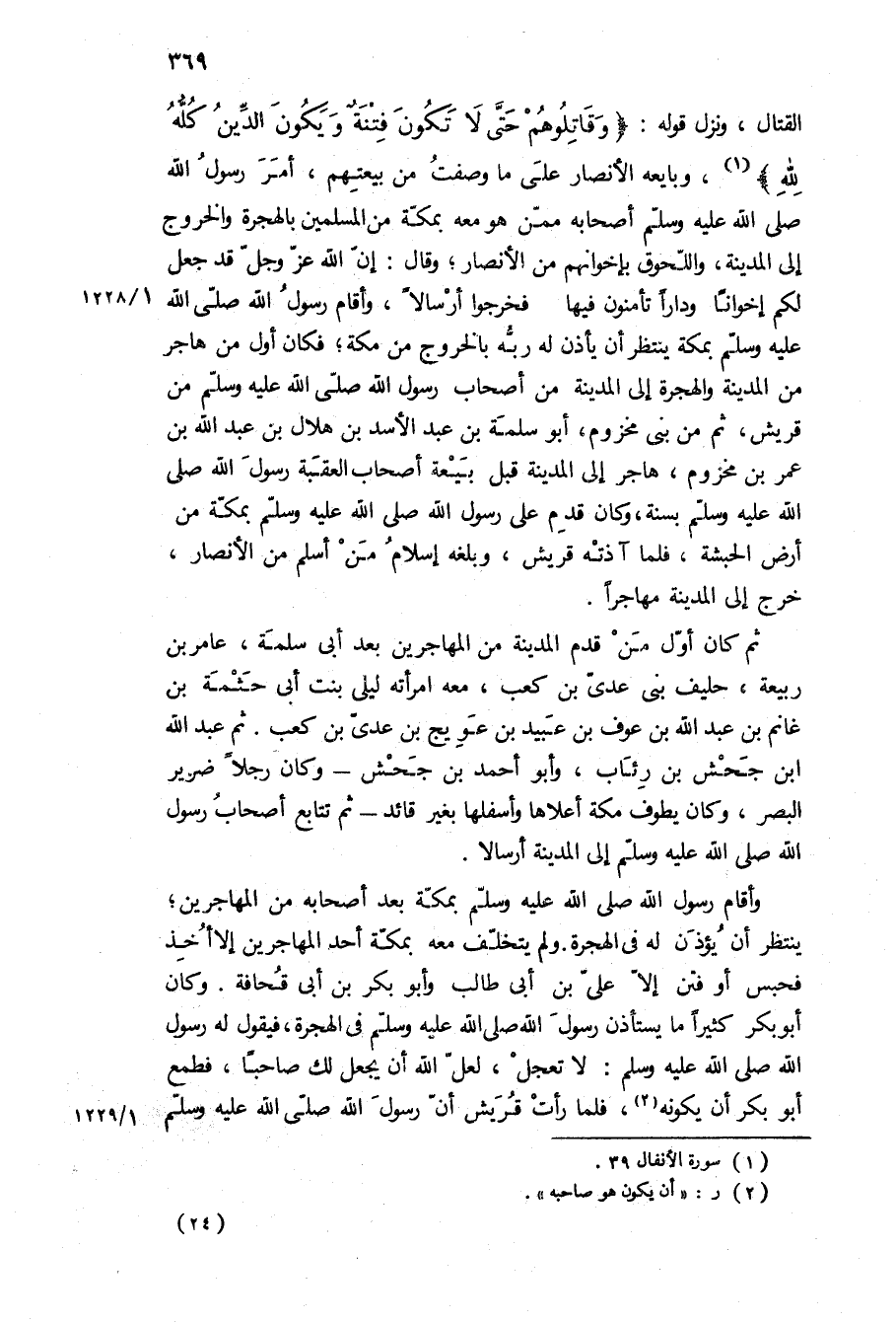 الْقِتَالِ، وَنَزَلَ قَوْلُهُ: «وَقاتِلُوهُمْ حَتَّى لا تَكُونَ فِتْنَةٌ وَيَكُونَ الدِّينُ كُلُّهُ لِلَّهِ» ، وَبَايَعَهُ الأَنْصَارُ عَلَى مَا وَصَفْتُ مِنْ بَيْعَتِهِمْ، امر رسول الله ص أَصْحَابَهُ مِمَّنْ هُوَ مَعَهُ بِمَكَّةَ مِنَ الْمُسْلِمِينَ بِالْهِجْرَةِ وَالْخُرُوجِ إِلَى الْمَدِينَةِ، وَاللُّحُوقِ بِإِخْوَانِهِمْ مِنَ الأَنْصَارِ، [وَقَالَ: إِنَّ اللَّهَ عَزَّ وَجَلَّ قَدْ جَعَلَ لَكُمْ إِخْوَانًا وَدَارًا تَأْمَنُونَ فِيهَا] فَخَرَجُوا إرسالا، واقام رسول الله ص بِمَكَّةَ يَنْتَظِرُ أَنْ يَأْذَنَ لَهُ رَبُّهُ بِالْخُرُوجِ من مكة، فكان أول من هاجر من المدينة والهجره إِلَى الْمَدِينَةِ مِنْ أَصْحَابِ رَسُولِ اللَّهِ صَلَّى اللَّهُ عَلَيْهِ وَسَلَّمَ مِنْ قُرَيْشٍ، ثُمَّ مِنْ بَنِي مَخْزُومٍ، أَبُو سَلَمَةَ بْنُ عَبْدِ الأَسَدِ بْن هلال بْن عبد الله بْن عمر بْنِ مَخْزُومٍ، هَاجَرَ إِلَى الْمَدِينَةِ قَبْلَ بَيْعَةِ اصحاب العقبه رسول الله ص بسنه، وكان قدم على رسول الله ص بمكة من ارض الحبشه، فلما آذَتْهُ قُرَيْشٌ، وَبَلَغَهُ إِسْلامُ مَنْ أَسْلَمَ مِنَ الأَنْصَارِ، خَرَجَ إِلَى الْمَدِينَةِ مُهَاجِرًا.