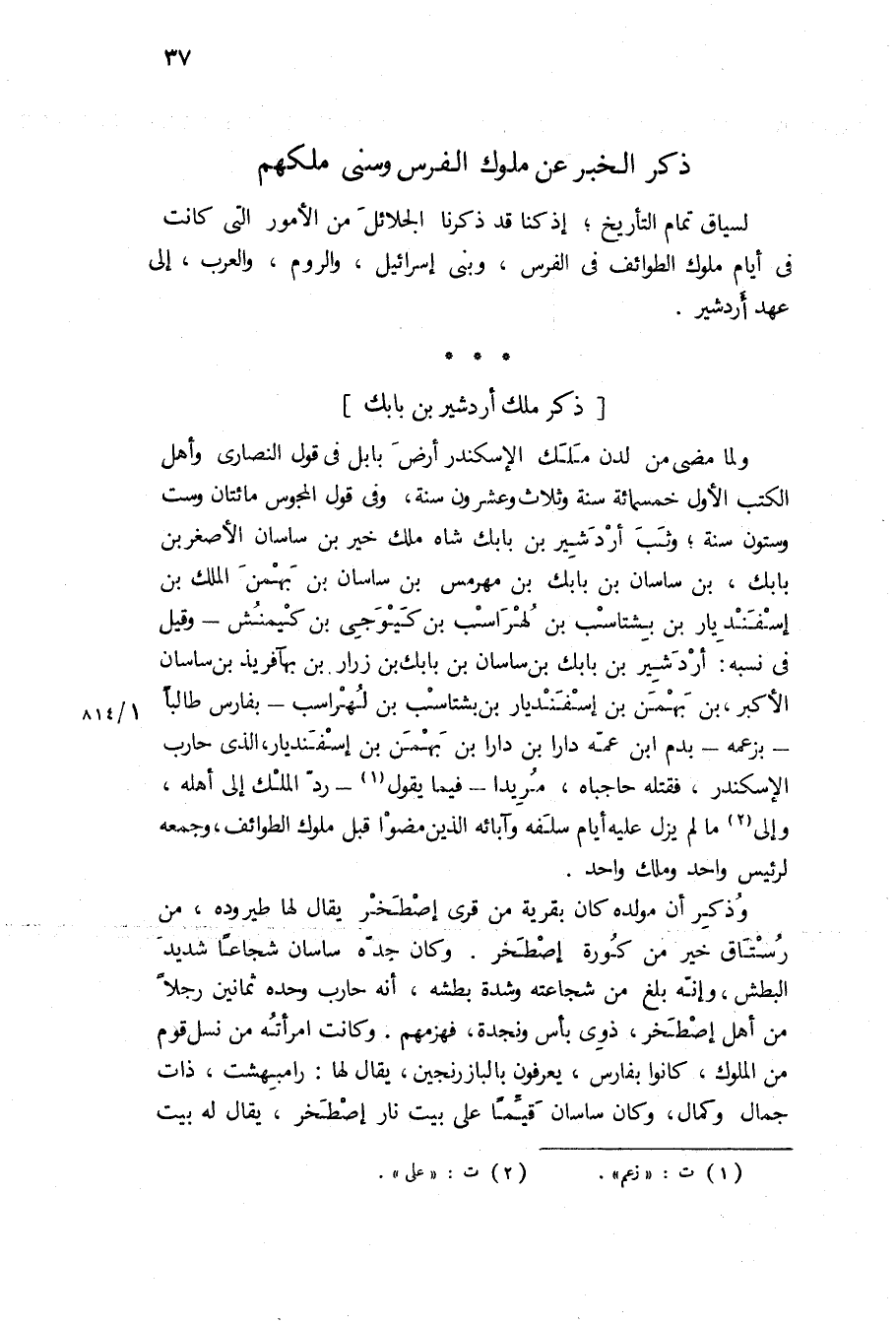 لسياق تمام التأريخ، إذ كنا قد ذكرنا الجلائل من الأمور التي كانت في أيام ملوك الطوائف في الفرس، وبني إسرائيل، والروم، والعرب، الى عهد أردشير.