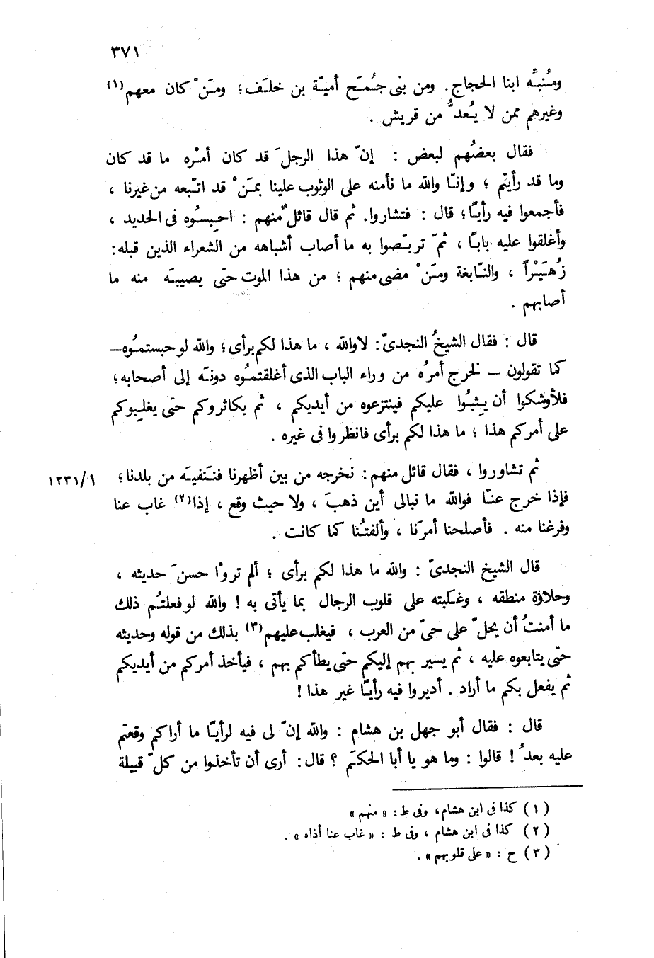 قَالَ الشَّيْخُ النَّجْدِيُّ: وَاللَّهِ مَا هَذَا لَكُمْ بِرَأْيٍ، أَلَمْ تَرَوْا حُسْنَ حَدِيثِهِ، وَحَلاوَةَ مَنْطِقِهِ، وَغَلَبَتَهُ عَلَى قُلُوبِ الرِّجَالِ بِمَا يَأْتِي بِهِ! وَاللَّهِ لَوْ فَعَلْتُمْ ذَلِكَ مَا أَمِنْتُ أَنْ يَحِلَّ عَلَى حَيٍّ مِنَ الْعَرَبِ، فَيَغْلِبَ عَلَيْهِمْ بِذَلِكَ مِنْ قَوْلِهِ وَحَدِيثِهِ حَتَّى يُتَابِعُوهُ عَلَيْهِ، ثُمَّ يَسِيرُ بِهِمْ إِلَيْكُمْ حَتَّى يَطَأَكُمْ بِهِمْ، فَيَأْخُذَ أَمْرَكُمْ مِنْ أَيْدِيكُمْ ثُمَّ يَفْعَلَ بِكُمْ مَا أَرَادَ أَدِيرُوا فِيهِ رَأْيًا غَيْرَ هَذَا! قَالَ: فَقَالَ أَبُو جَهْلِ بْنُ هِشَامٍ: وَاللَّهِ إِنَّ لِي فِيهِ لَرَأْيًا مَا أَرَاكُمْ وَقَعْتُمْ عَلَيْهِ بَعْدُ! قَالُوا: وَمَا هُوَ يَا أَبَا الْحَكَمِ؟ قَالَ: أَرَى أَنْ تَأْخُذُوا مِنْ كُلِّ قبيله