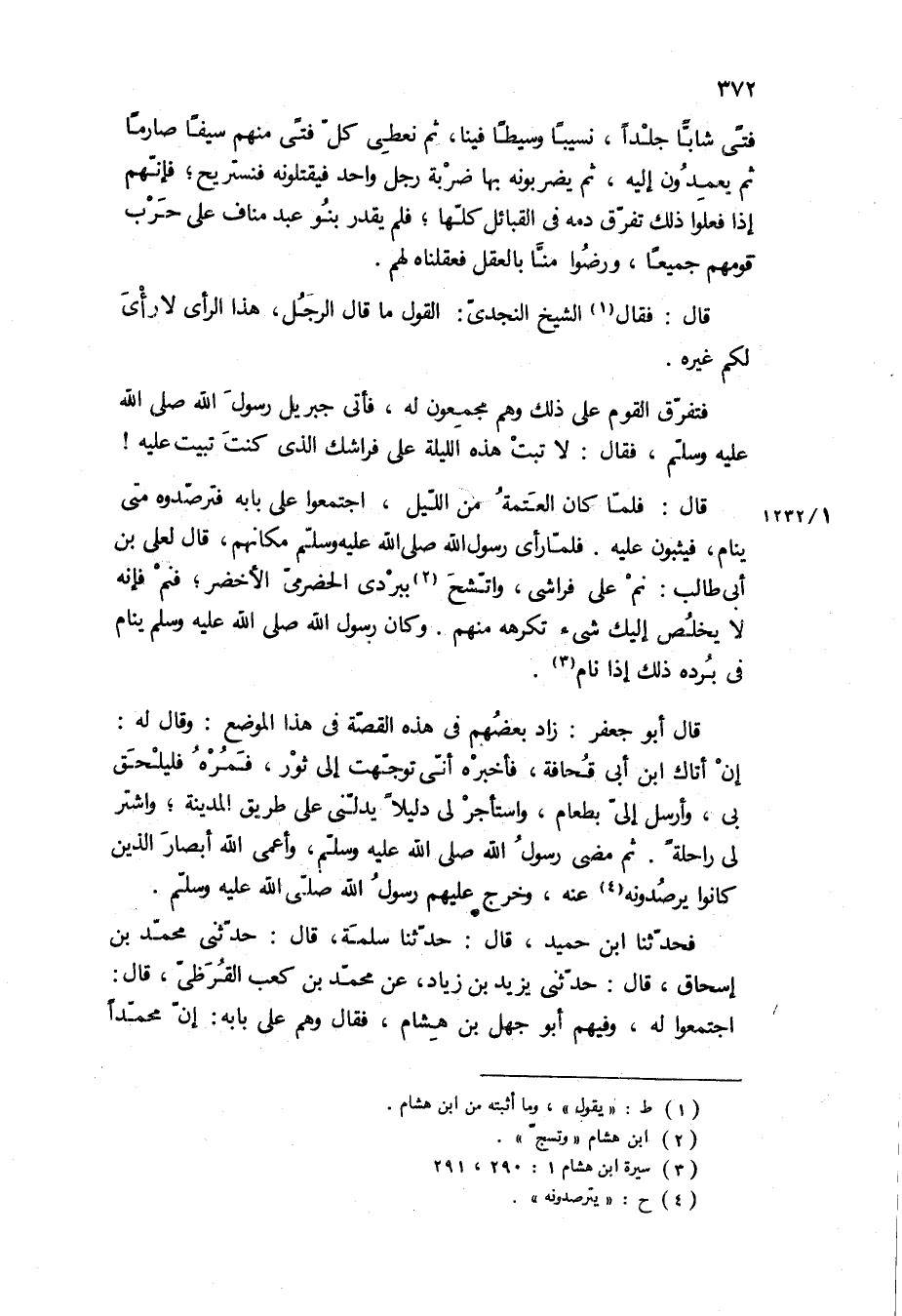فَتَفَرَّقَ الْقَوْمُ عَلَى ذَلِكَ وَهُمْ مُجْمِعُونَ لَهُ، فَأَتَى جِبْرِيلُ رسول الله ص، فَقَالَ: لا تَبِتْ هَذِهِ اللَّيْلَةَ عَلَى فِرَاشِكَ الَّذِي كُنْتَ تَبِيتُ عَلَيْهِ! قَالَ: فَلَمَّا كَانَ الْعَتَمَةُ مِنَ اللَّيْلِ، اجْتَمَعُوا عَلَى بَابِهِ فَتَرَصَّدُوهُ مَتَى يَنَامُ، فَيَثِبُونَ عَلَيْهِ فَلَمَّا رَأَى رَسُولُ الله ص مَكَانَهُمْ، [قَالَ لِعَلِيِّ بْنِ أَبِي طَالِبٍ: نَمْ عَلَى فِرَاشِي، وَاتَّشِحْ بِبُرْدِي الْحَضْرَمِيِّ الأَخْضَرِ، فَنَمْ فَإِنَّهُ لا يَخْلُصُ إِلَيْكَ شَيْءٌ تَكْرَهُهُ مِنْهُمْ] وكان رسول الله ص يَنَامُ فِي بُرْدِهِ ذَلِكَ إِذَا نَامَ.