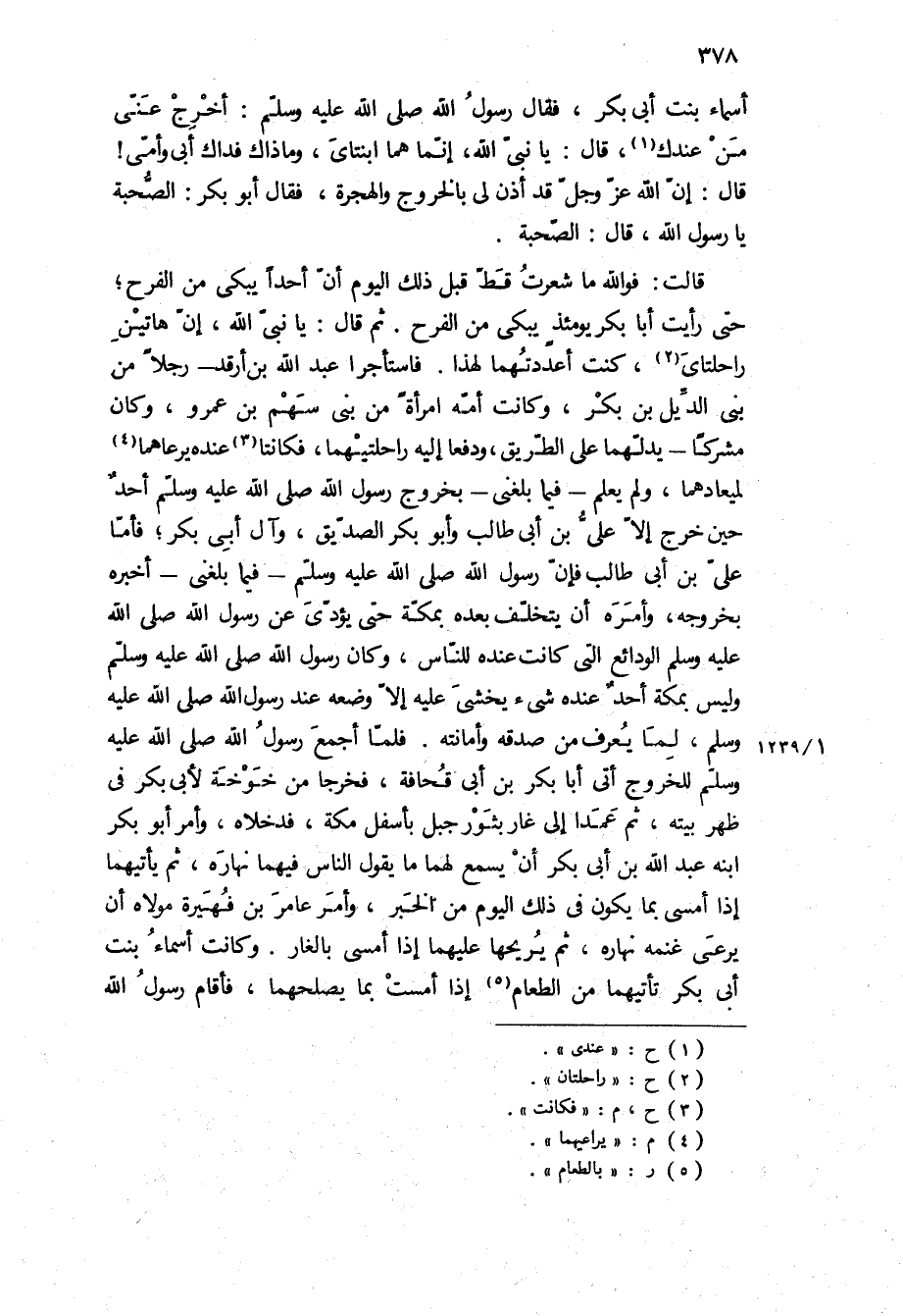 قالت: فو الله مَا شَعُرْتُ قَطُّ قَبْلَ ذَلِكَ الْيَوْمِ أَنَّ أَحَدًا يَبْكِي مِنَ الْفَرَحِ، حَتَّى رَأَيْتُ أَبَا بَكْرٍ يَوْمَئِذٍ يَبْكِي مِنَ الْفَرَحِ ثُمَّ قَالَ: يَا نَبِيَّ اللَّهِ، إِنَّ هَاتَيْنِ رَاحِلَتَايَ، كُنْتُ أَعْدَدْتُهُمَا لِهَذَا فَاسْتَأْجَرَا عَبْدَ اللَّهِ بْنَ أَرْقَدَ- رَجُلا مِنْ بَنِي الدِّيلِ بْنِ بَكْرٍ، وَكَانَتْ أُمُّهُ امْرَأَةً مِنْ بَنِي سَهْمِ بْنِ عَمْرٍو، وَكَانَ مُشْرِكًا- يَدُلُّهُمَا عَلَى الطَّرِيقِ، وَدَفَعَا إِلَيْهِ رَاحِلَتَيْهِمَا، فَكَانَتَا عِنْدَهُ يَرْعَاهُمَا لِمِيعَادِهِمَا، وَلَمْ يَعْلَمْ- فيما بلغنى- بخروج رسول الله ص أَحَدٌ حِينَ خَرَجَ إِلا عَلِيُّ بْنُ أَبِي طَالِبٍ وَأَبُو بَكْرٍ الصِّدِّيقُ، وَآلُ أَبِي بَكْرٍ، فَأَمَّا عَلِيُّ بْنُ أَبِي طَالِبٍ فَإِنَّ رَسُولَ الله ص- فِيمَا بَلَغَنِي- أَخْبَرَهُ بِخُرُوجِهِ، وَأَمَرَهُ أَنْ يَتَخَلَّفَ بَعْدَهُ بِمَكَّةَ حَتَّى يُؤَدِّيَ عَنْ رَسُولِ اللَّهِ ص الْوَدَائِعَ الَّتِي كَانَتْ عِنْدَهُ لِلنَّاسِ، وَكَانَ رَسُولُ الله ص وَلَيْسَ بِمَكَّةَ أَحَدٌ عِنْدَهُ شَيْءٌ يَخْشَى عَلَيْهِ الا وضعه عند رسول الله ص، لِمَا يُعْرَفُ مِنْ صِدْقِهِ وَأَمَانَتِهِ فَلَمَّا أَجْمَعَ رسول الله ص لِلْخُرُوجِ أَتَى أَبَا بَكْرِ بْنَ أَبِي قُحَافَةَ، فَخَرَجَا مِنْ خَوْخَةٍ لأَبِي بَكْرٍ فِي ظَهْرِ بَيْتِهِ، ثُمَّ عَمَدَا إِلَى غَارٍ بِثَوْرِ جَبَلٍ بِأَسْفَلِ مَكَّةَ، فَدَخَلاهُ، وَأَمَرَ أَبُو بَكْرٍ ابْنَهُ عَبْدَ اللَّهِ بْنَ أَبِي بَكْرٍ أَنْ يَسْمَعَ لَهُمَا مَا يَقُولُ النَّاسُ فِيهِمَا نَهَارَهُ، ثُمَّ يَأْتِيهِمَا إِذَا أَمْسَى بِمَا يَكُونُ فِي ذَلِكَ الْيَوْمِ مِنَ الْخَبَرِ، وَأَمَرَ عَامِرَ بْنَ فُهَيْرَةَ مَوْلاهُ أَنْ يَرْعَى غَنَمَهُ نَهَارَهُ، ثُمَّ يُرِيحَهَا عَلَيْهِمَا إِذَا أَمْسَى بِالْغَارِ وَكَانَتْ أَسْمَاءُ بِنْتُ أَبِي بَكْرٍ تَأْتِيهِمَا مِنَ الطَّعَامِ إِذَا أَمْسَتْ بما يصلحهما، فأقام رسول الله