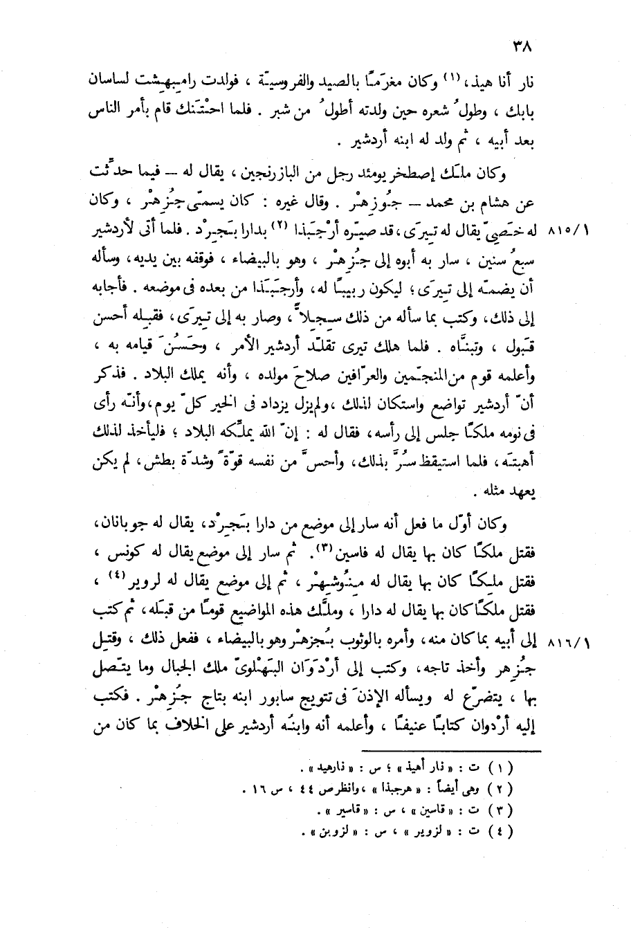 وكان ملك إصطخر يومئذ رجل من البازرنجين، يقال لَهُ- فِيمَا حدثت عن هِشَام بن مُحَمَّد- جوزهر وقال غيره: كان يسمى جزهر، وكان له خصي يقال له تيرى، قد صيره ارجبذا بدارابجرد فلما أتى لأردشير سبع سنين، سار به أبوه إلى جزهر، وهو بالبيضاء، فوقفه بين يديه، وسأله أن يضمه إلى تيرى، ليكون ربيبا له، وأرجبذا من بعده في موضعه فأجابه إلى ذلك، وكتب بما سأله من ذلك سجلا، وصار به إلى تيرى، فقبله أحسن قبول، وتبناه فلما هلك تيرى تقلد أردشير الأمر، وحسن قيامه به وأعلمه قوم من المنجمين والعرافين صلاح مولده، وأنه يملك البلاد فذكر أن أردشير تواضع واستكان لذلك، ولم يزل يزداد في الخير كل يوم، وأنه رأى في نومه ملكا جلس إلى رأسه، فقال له: إن الله يملكه البلاد، فليأخذ لذلك أهبته، فلما استيقظ سر بذلك، وأحس من نفسه قوة وشدة بطش، لم يكن يعهد مثله.