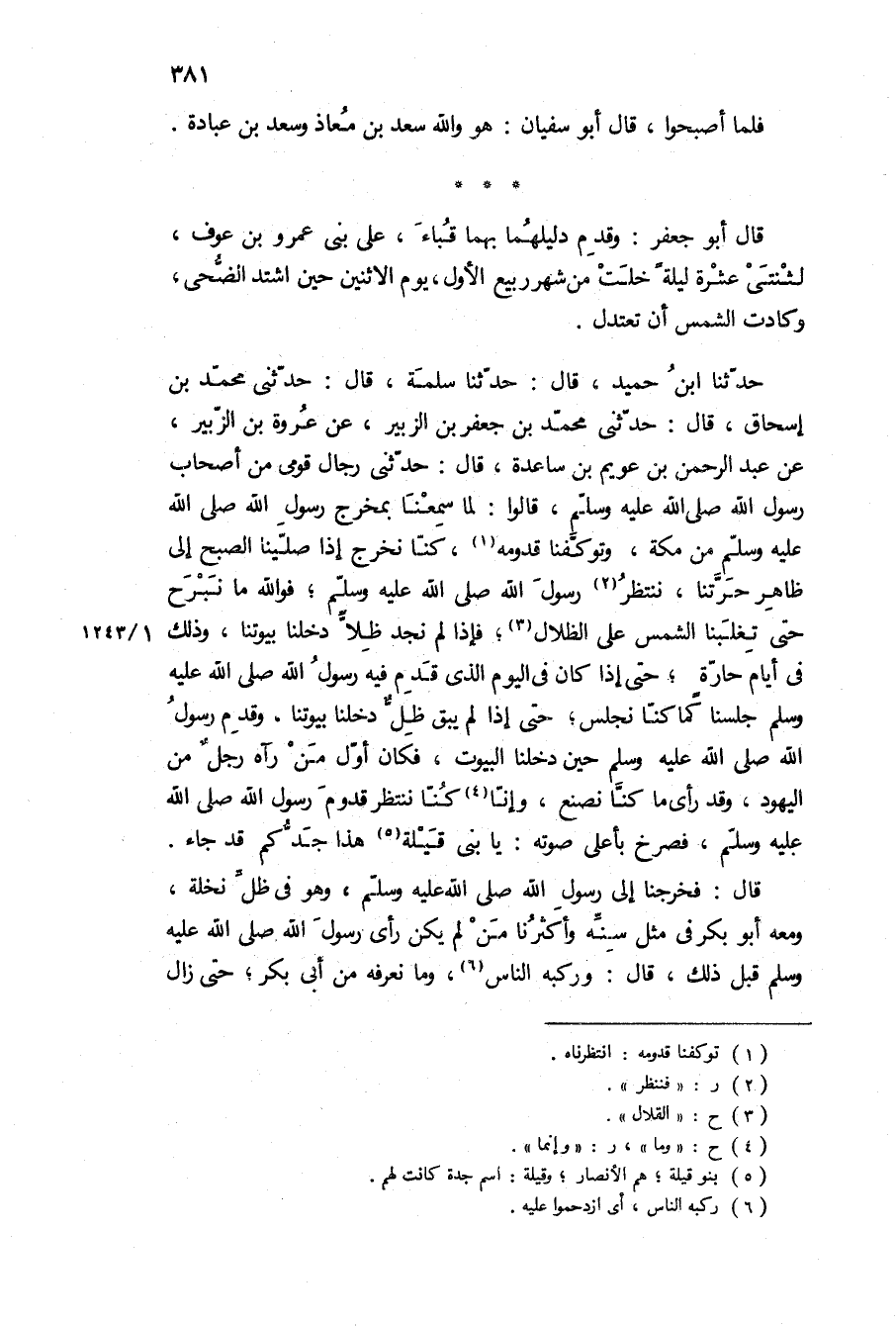 حدثنا ابن حميد، قال: حدثنا سلمة، قال: حَدَّثَنِي مُحَمَّدُ بْنُ إِسْحَاقَ، قَالَ: حَدَّثَنِي مُحَمَّدُ بْنُ جَعْفَرِ بْنِ الزُّبَيْرِ، عَنْ عُرْوَةَ بْنِ الزُّبَيْرِ، عَنْ عَبْدِ الرَّحْمَنِ بْنِ عُوَيْمِ بْنِ سَاعِدَةَ، قَالَ: حَدَّثَنِي رِجَالُ قَوْمِي مِنْ أَصْحَابِ رسول الله ص، قالوا: لما سمعنا بمخرج رسول الله ص مِنْ مَكَّةَ، وَتَوَكَّفْنَا قُدُومَهُ، كُنَّا نَخْرُجُ إِذَا صَلَّيْنَا الصُّبْحَ إِلَى ظَاهِرِ حَرَّتِنَا، نَنْتَظِرُ رَسُولَ الله ص، فو الله مَا نَبْرَحُ حَتَّى تَغْلِبَنَا الشَّمْسُ عَلَى الظِّلَالِ، فَإِذَا لَمْ نَجِدْ ظِلًّا دَخَلْنَا بُيُوتَنَا، وَذَلِكَ فِي أَيَّامٍ حَارَّةٍ، حَتَّى إِذَا كَانَ فِي اليوم الذى قدم فيه رسول الله ص جَلَسْنَا كَمَا كُنَّا نَجْلِسُ، حَتَّى إِذَا لَمْ يَبْقَ ظِلٌّ دَخَلْنَا بُيُوتَنَا، وَقَدِمَ رَسُولُ اللَّهِ ص حِينَ دَخَلْنَا الْبُيُوتَ، فَكَانَ أَوَّلَ مَنْ رَآهُ رَجُلٌ مِنَ الْيَهُودِ، وَقَدْ رَأَى مَا كُنَّا نَصْنَعُ، وَإِنَّا كُنَّا نَنْتَظِرُ قُدُومَ رَسُولِ اللَّهِ ص، فَصَرَخَ بِأَعْلَى صَوْتِهِ: يَا بَنِي قَيْلَةَ هَذَا جَدُّكُمْ قَدْ جَاءَ.
