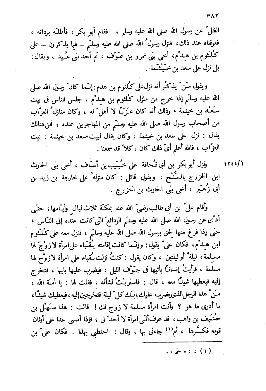 الظل عن رسول الله ص، فَقَامَ أَبُو بَكْرٍ، فَأَظَلَّهُ بِرِدَائِهِ، فَعَرَفْنَاهُ عِنْدَ ذلك، فنزل رسول الله ص- فِيمَا يَذْكُرُونَ- عَلَى كُلْثُومِ بْنِ هدم، أَخِي بَنِي عَمْرِو بْنِ عَوْفٍ، ثُمَّ أَحَدُ بَنِي عُبَيْدٍ، وَيُقَالُ: