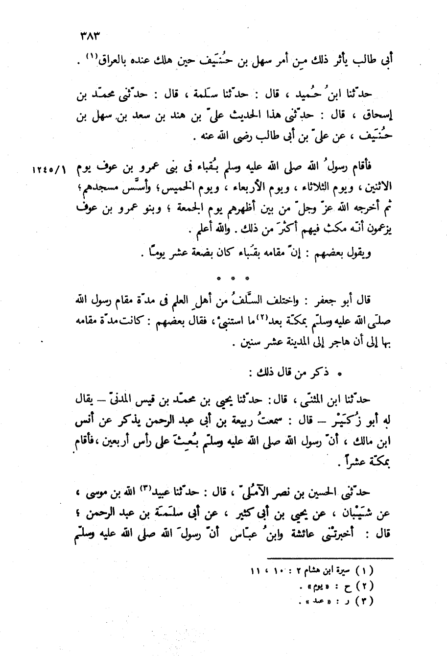 قال أبو جعفر: واختلف السلف من أهل العلم في مده مقام رسول الله ص بمكة بعد ما استنبئ، فقال بعضهم: كانت مدة مقامه بها إلى أن هاجر إلى المدينة عشر سنين.