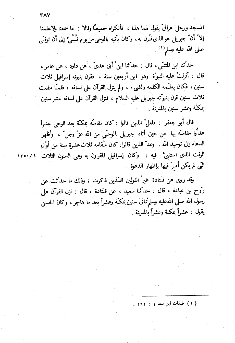 حَدَّثَنَا ابْنُ الْمُثَنَّى، قَالَ: حَدَّثَنَا ابْنُ أَبِي عَدِيٍّ، عَنْ دَاوُدَ، عَنْ عَامِرٍ، قَالَ: أُنْزِلَتْ عَلَيْهِ النُّبُوَّةُ وَهُوَ ابْنُ أَرْبَعِينَ سَنَةً، فَقُرِنَ بِنُبُوَّتِهِ إِسْرَافِيلُ ثَلاثَ سِنِينَ، فَكَانَ يُعَلِّمُهُ الْكَلِمَةَ وَالشَّيْءَ، وَلَمْ يَنْزِلِ الْقُرْآنُ عَلَى لِسَانِهِ، فَلَمَّا مضت ثلاث سنين قرن بنبوته جبريل ع، فَنَزَلَ الْقُرْآنُ عَلَى لِسَانِهِ عَشْرَ سِنِينَ بِمَكَّةَ وَعَشْرَ سِنِينَ بِالْمَدِينَةِ.