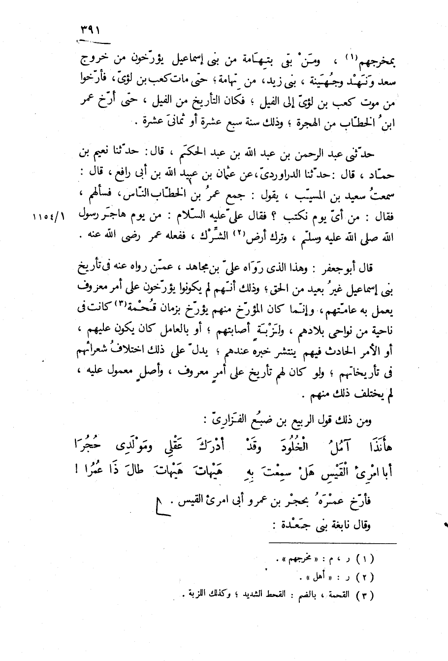 سَمِعْتُ سَعِيدَ بْنَ الْمُسَيِّبِ، يَقُولُ: جَمَعَ عُمَرُ بْنُ الْخَطَّابِ النَّاسَ، فَسَأَلَهُمْ، فَقَالَ: من اى يوم نكتب؟ [فقال على ع: من يوم هاجر رسول الله ص، وَتَرَكَ أَرْضَ الشِّرْكِ] ، فَفَعَلَهُ عُمَرُ رَضِيَ اللَّهُ عَنْهُ قال أبو جعفر: وهذا الذي رواه علي بن مجاهد، عمن رواه عنه في تأريخ بني إسماعيل غير بعيد من الحق، وذلك انهم لم يكونوا يؤرخون على أمر معروف يعمل به عامتهم، وإنما كان المؤرخ منهم يؤرخ بزمان قحمة كانت في ناحية من نواحي بلادهم، ولزبة أصابتهم، أو بالعامل كان يكون عليهم، أو الأمر الحادث فيهم ينتشر خبره عندهم، يدل على ذلك اختلاف شعرائهم في تأريخاتهم، ولو كان لهم تأريخ على أمر معروف، وأصل معمول عليه، لم يختلف ذلك منهم.