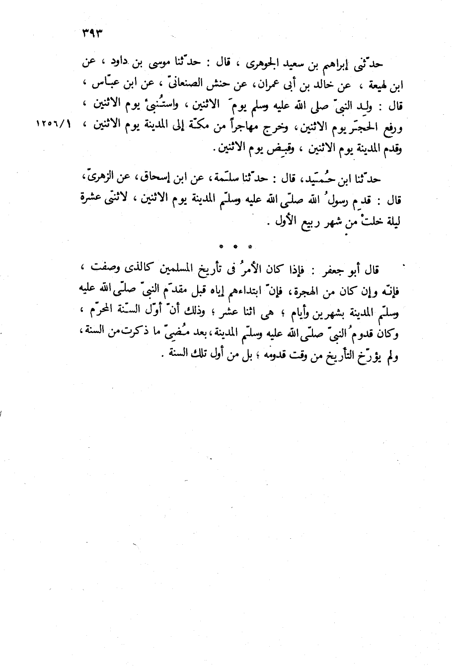 حَدَّثَنِي إِبْرَاهِيمُ بْنُ سَعِيدٍ الْجَوْهَرِيُّ، قَالَ: حَدَّثَنَا مُوسَى بْنُ دَاوُدَ، عَنِ ابْنِ لَهِيعَةَ، عَنْ خَالِدِ بْنِ أَبِي عِمْرَانَ، عَنْ حَنَشٍ الصَّنْعَانِيِّ، عن ابن عباس قال: ولد النبي ص يَوْمَ الاثْنَيْنِ، وَاسْتُنْبِئَ يَوْمَ الاثْنَيْنِ، وَرَفَعَ الْحَجَرَ يَوْمَ الاثْنَيْنِ، وَخَرَجَ مُهَاجِرًا مِنْ مَكَّةَ إِلَى الْمَدِينَةِ يَوْمَ الاثْنَيْنِ، وَقَدِمَ الْمَدِينَةَ يَوْمَ الاثْنَيْنِ، وَقُبِضَ يَوْمَ الاثْنَيْنِ.