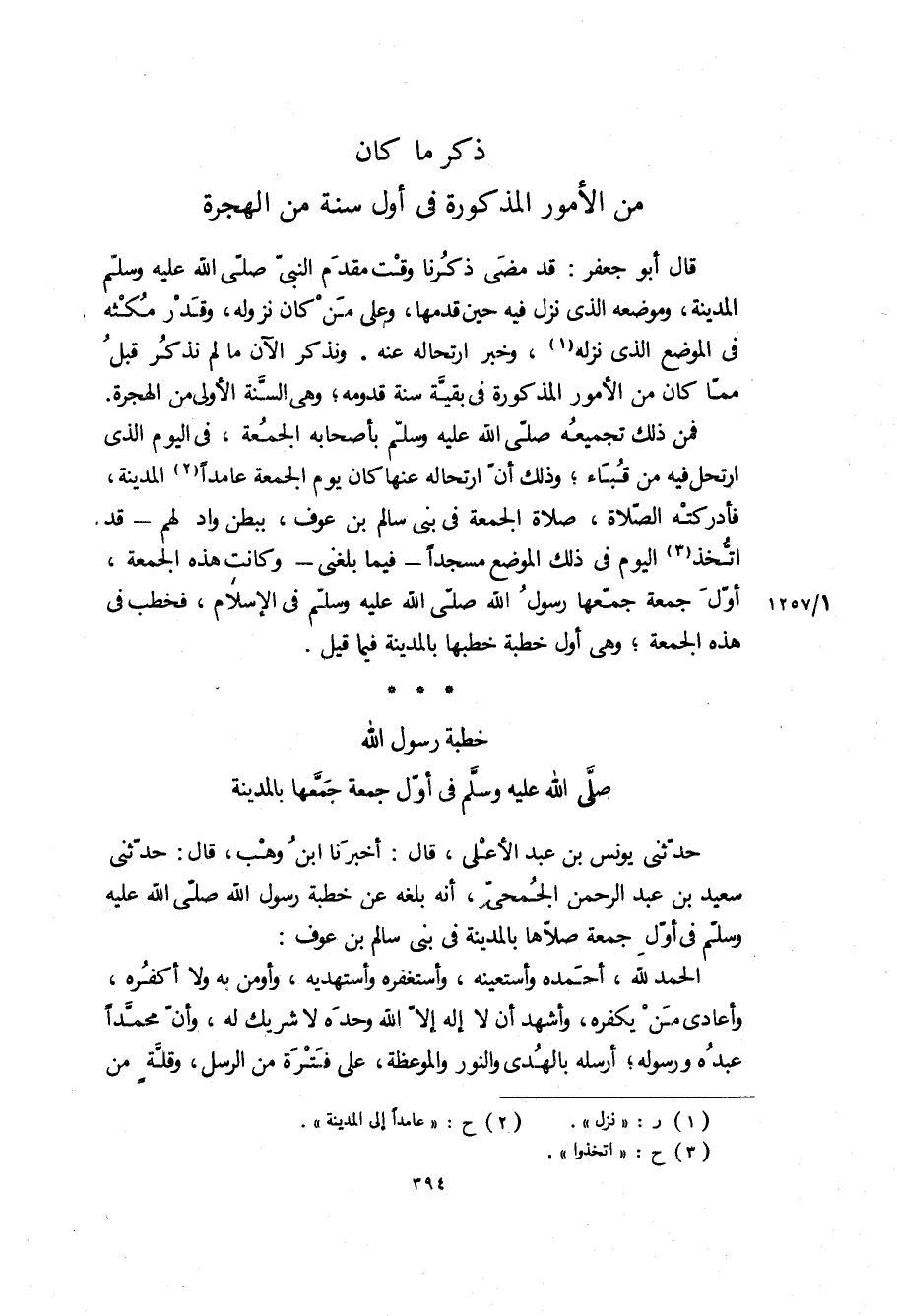 حَدَّثَنِي يُونُسُ بْنُ عَبْدِ الأَعْلَى، قَالَ: أَخْبَرَنَا ابن وهب، قَالَ: حَدَّثَنِي سَعِيدُ بْنُ عَبْدِ الرَّحْمَنِ الْجُمَحِيُّ، انه بلغه عن خطبه رسول الله ص فِي أَوَّلِ جُمُعَةٍ صَلاهَا بِالْمَدِينَةِ فِي بَنِي سَالِمِ بْنِ عَوْفٍ: