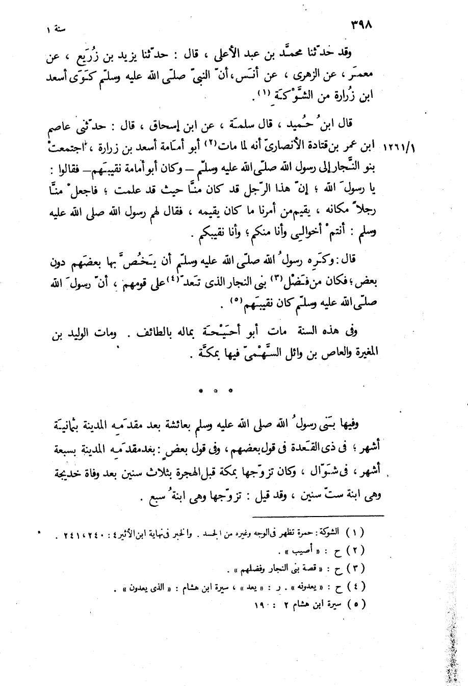 وَفِيهَا بَنَى رَسُولِ الله ص بِعَائِشَةَ بَعْدَ مَقْدِمِهِ الْمَدِينَةَ بِثَمَانِيَةِ أَشْهُرٍ، فِي ذِي الْقِعْدَةِ فِي قَوْلِ بَعْضِهِمْ، وَفِي قَوْلِ بَعْضٍ: بَعْدَ مَقْدَمِهِ الْمَدِينَةَ بِسَبْعَةِ أَشْهُرٍ، فِي شَوَّالٍ، وَكَانَ تَزَوَّجَهَا بِمَكَّةَ قَبْلَ الْهِجْرَةِ بِثَلاثِ سِنِينَ بَعْدَ وَفَاةِ خَدِيجَةَ وَهِيَ ابْنَةُ سِتِّ سِنِينَ، وَقَدْ قِيلَ: تَزَوَّجَهَا وَهِيَ ابْنَةُ سَبْعٍ