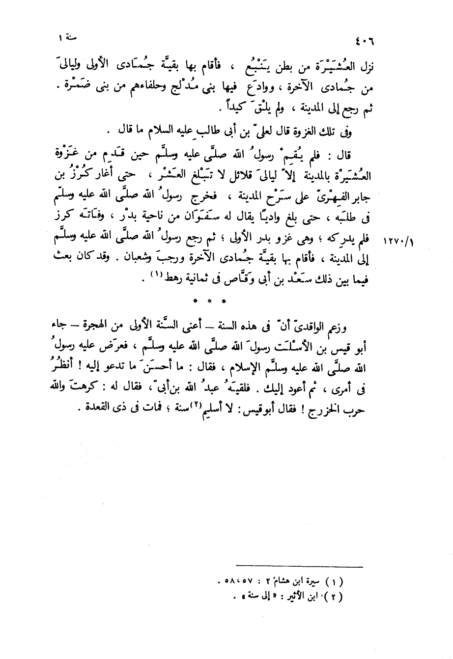 قَالَ: فَلَمْ يَقُمْ رَسُولُ اللَّهِ ص حِينَ قَدِمَ مِنْ غَزْوَةِ الْعُشَيْرَةِ بِالْمَدِينَةِ إِلَّا ليالي قَلَائِلَ لا تَبْلُغُ الْعُشْرَ، حَتَّى أَغَارَ كُرْزُ بْنُ جَابِرٍ الْفِهْرِيُّ عَلَى سَرْحِ الْمَدِينَةِ، فَخَرَجَ رسول الله ص فِي طَلَبِهِ، حَتَّى بَلَغَ وَادِيًا يُقَالُ لَهُ سَفَوَانُ مِنْ نَاحِيَةِ بَدْرٍ، وَفَاتَهُ كُرْزٌ فَلَمْ يدركه، وهي غزو بدر الاولى، ثم رجع رسول الله ص إِلَى الْمَدِينَةِ، فَأَقَامَ بِهَا بَقِيَّةَ جُمَادَى الآخِرَةِ ورجب وَشَعْبَانَ وَقَدْ كَانَ بَعَثَ فِيمَا بَيْنَ ذَلِكَ سَعْدَ بْنَ أَبِي وَقَّاصٍ فِي ثَمَانِيَةِ رَهْطٍ.