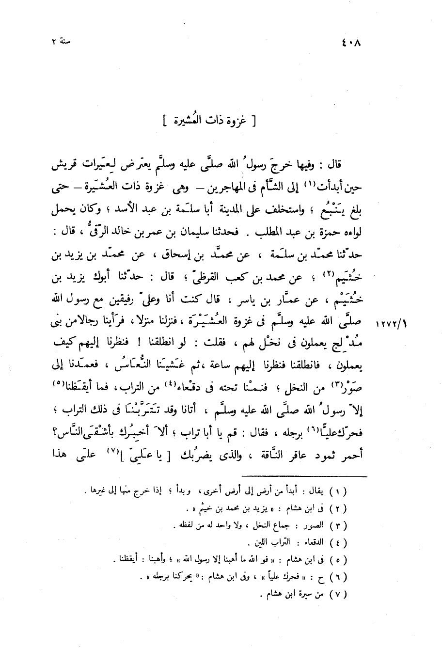 قال: وفيها خرج رسول الله ص يعترض لعيرات قريش حين أبدأت إلى الشام في المهاجرين- وهي غزوة ذات العشيرة- حتى بلغ ينبع، واستخلف على المدينة أبا سلمة بن عبد الأسد، وكان يحمل لواءه حمزة بن عبد المطلب فَحَدَّثَنَا سُلَيْمَانُ بْنُ عُمَرَ بْنِ خَالِدٍ الرَّقِّيُّ، قَالَ: