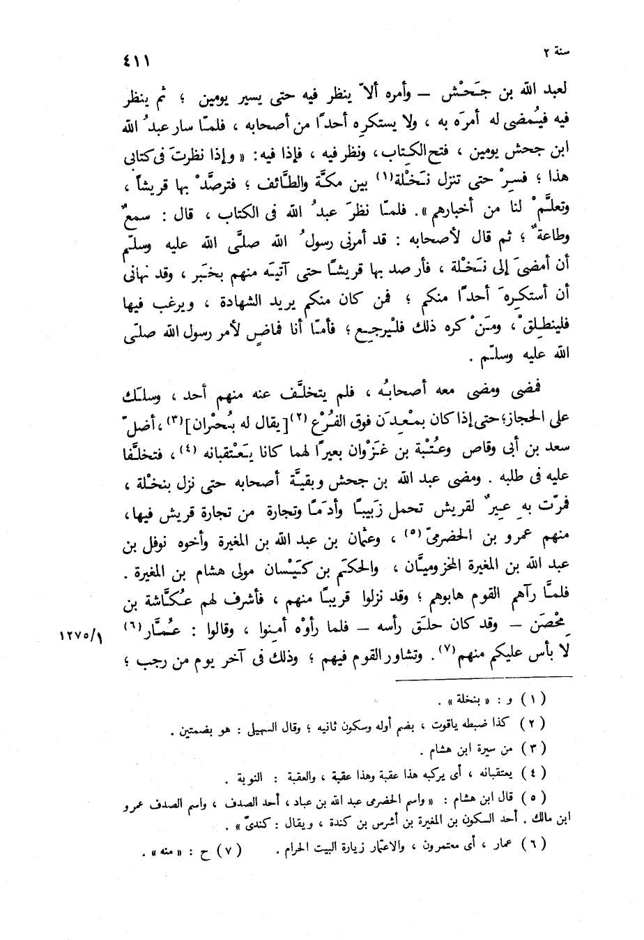 لِعَبْدِ اللَّهِ بْنِ جَحْشٍ- وَأَمَرَهُ أَلَّا يَنْظُرَ فِيهِ حَتَّى يَسِيرَ يَوْمَيْنِ، ثُمَّ يَنْظُرَ فِيهِ فَيُمْضِيَ لَهُ أَمْرَهُ بِهِ، وَلا يَسْتَكْرِهَ أَحَدًا من اصحابه، فلما سار عبد الله ابن جَحْشٍ يَوْمَيْنِ، فَتَحَ الْكِتَابَ، وَنَظَرَ فِيهِ، فَإِذَا فيه: وإذا نَظَرْتَ فِي كِتَابِي هَذَا، فِسِرْ حَتَّى تَنْزِلَ نَخْلَةً بَيْنَ مَكَّةَ وَالطَّائِفِ، فَتَرَصَّدْ بِهَا قُرَيْشًا، وَتَعَلَّمْ لَنَا مِنْ أَخْبَارِهِمْ فَلَمَّا نَظَرَ عَبْدُ اللَّهِ فِي الْكِتَابِ، قَالَ: سَمْعٌ وَطَاعَةٌ، ثُمَّ قال لأصحابه: قد أمرني رسول الله ص أَنْ أَمْضِيَ إِلَى نَخْلَةٍ، فَأَرْصُدَ بِهَا قُرَيْشًا حَتَّى آتِيَهُ مِنْهُمْ بِخَبَرٍ، وَقَدْ نَهَانِي أَنْ أَسْتَكْرِهَ أَحَدًا مِنْكُمْ، فَمَنْ كَانَ مِنْكُمْ يُرِيدُ الشَّهَادَةَ، وَيَرْغَبُ فِيهَا فَلْيَنْطَلِقْ، وَمَنْ كَرِهَ ذَلِكَ فَلْيَرْجِعْ، فَأَمَّا أَنَا فَمَاضٍ لأَمْرِ رَسُولِ اللَّهِ ص.