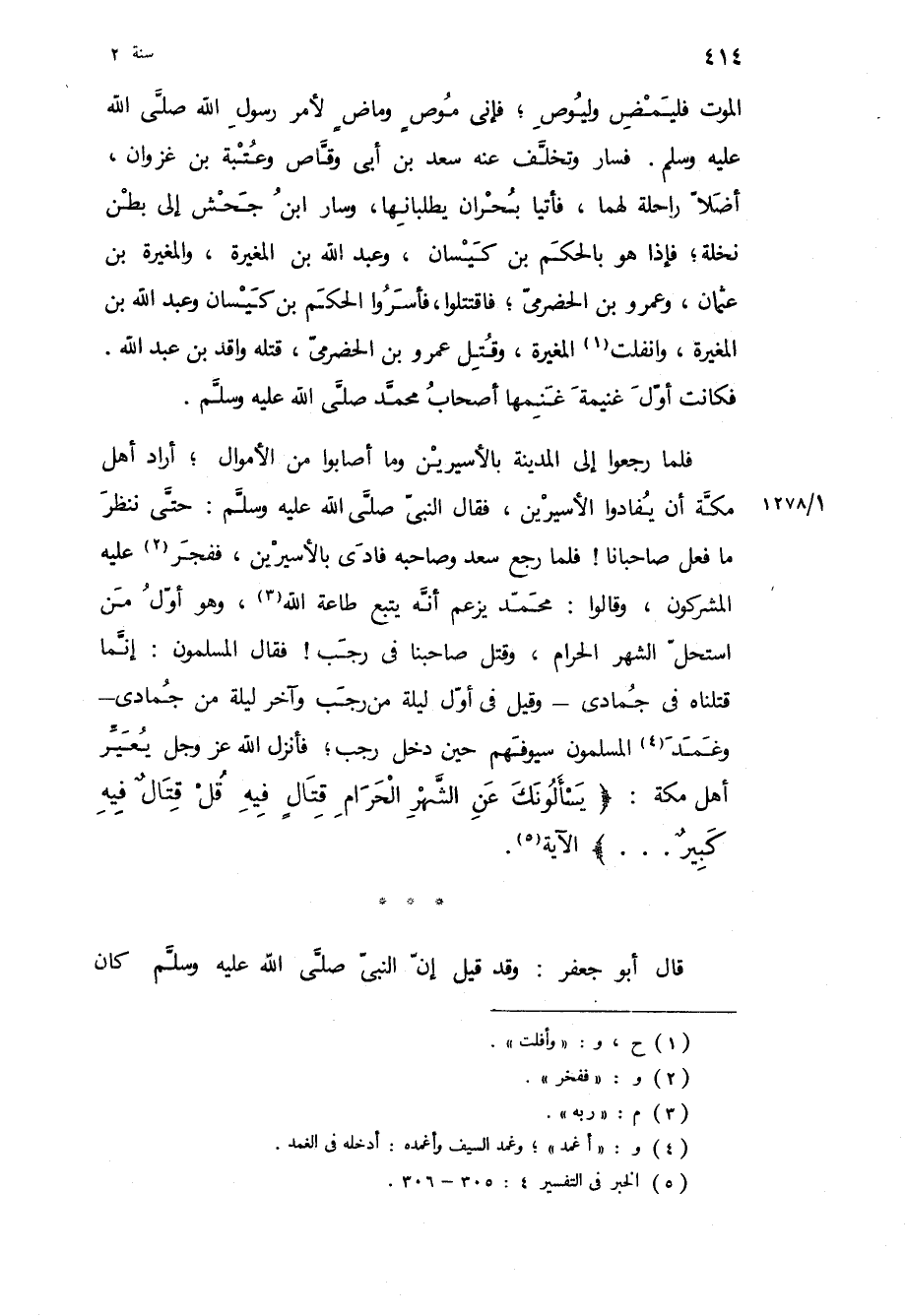 فَلَمَّا رَجَعُوا إِلَى الْمَدِينَةِ بِالأَسِيرَيْنِ وَمَا أَصَابُوا مِنَ الأَمْوَالِ، أَرَادَ أَهْلُ مَكَّةَ أَنْ يُفَادُوا الاسيرين، فقال النبي ص: حَتَّى نَنْظُرَ مَا فَعَلَ صَاحِبَانَا: فَلَمَّا رَجَعَ سَعْدٌ وَصَاحِبُهُ فَادَى بِالأَسِيرَيْنِ، فَفَجَرَ عَلَيْهِ الْمُشْرِكُونَ، وَقَالُوا: مُحَمَّدٌ يَزْعُمُ أَنَّهُ يَتَّبِعُ طَاعَةَ اللَّهِ، وَهُوَ أَوَّلُ مَنِ اسْتَحَلَّ الشَّهْرَ الْحَرَامَ، وَقَتَلَ صَاحِبَنَا فِي رَجَبٍ! فَقَالَ الْمُسْلِمُونَ: إِنَّمَا قَتَلْنَاهُ فِي جُمَادَى- وَقِيلَ فِي أَوَّلِ لَيْلَةٍ مِنْ رَجَبٍ وَآخِرِ لَيْلَةٍ مِنْ جُمَادَى- وَغَمَدَ الْمُسْلِمُونَ سُيُوفَهُمْ حِينَ دَخَلَ رَجَبٌ، فَأَنْزَلَ اللَّهُ عَزَّ وجل يعير اهل مكة: «يَسْئَلُونَكَ عَنِ الشَّهْرِ الْحَرامِ قِتالٍ فِيهِ قُلْ قِتالٌ فِيهِ كَبِيرٌ» الآيَةَ قَالَ أَبُو جَعْفَرٍ: وَقَدْ قِيلَ إِنَّ النبي ص كان
