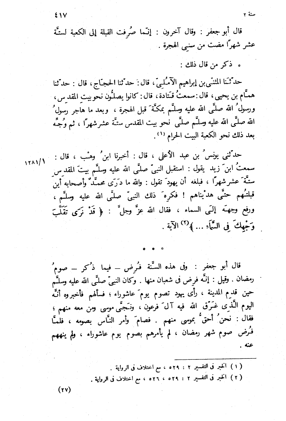 حَدَّثَنَا الْمُثَنَّى بْنُ إِبْرَاهِيمَ الآمِلِيُّ، قَالَ: حَدَّثَنَا الْحَجَّاجُ، قَالَ: حَدَّثَنَا هَمَّامُ بْنُ يَحْيَى، قَالَ: سَمِعْتُ قَتَادَةَ، قَالَ: كَانُوا يُصَلُّونَ نَحْوَ بَيْتِ المقدس، ورسول الله ص بمكة قبل الهجره، وبعد ما هاجر رسول الله ص صلى نَحْوَ بَيْتِ الْمَقْدِسِ سِتَّةَ عَشَرَ شَهْرًا، ثُمَّ وُجِّهَ بَعْدَ ذَلِكَ نَحْوَ الْكَعْبَةِ الْبَيْتِ الْحَرَامِ.