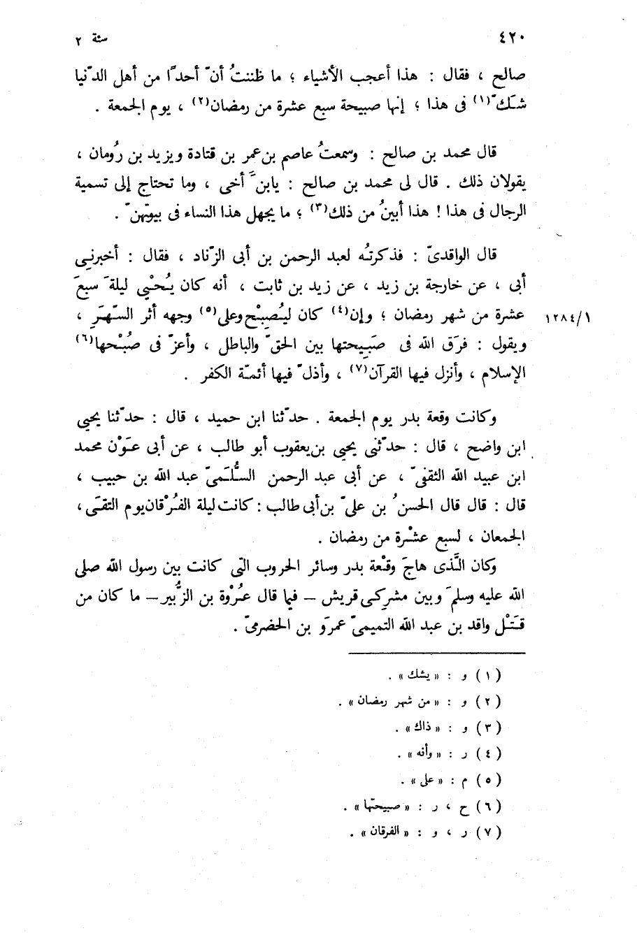 صَالِحٍ، فَقَالَ: هَذَا أَعْجَبُ الأَشْيَاءِ، مَا ظَنَنْتُ أَنَّ أَحَدًا مِنْ أَهْلِ الدُّنْيَا شَكَّ فِي هَذَا، إِنَّهَا صَبِيحَةَ سَبْعَ عَشْرَةَ مِنْ رَمَضَانَ، يَوْمَ الْجُمُعَةِ.