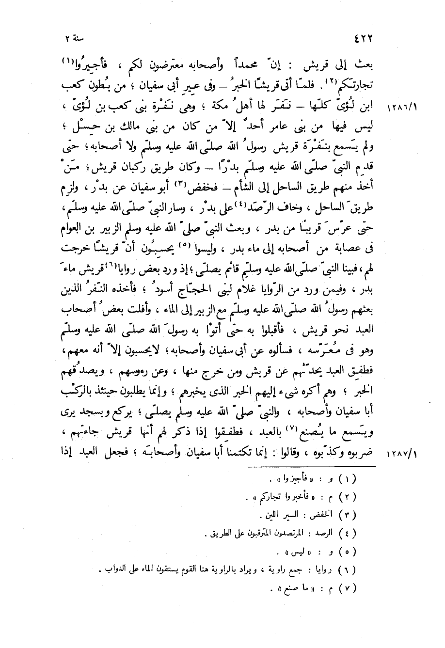 بَعَثَ إِلَى قُرَيْشٍ: إِنَّ مُحَمَّدًا وَأَصْحَابَهُ مُعْتَرِضُونَ لَكُمْ، فَأَجِيرُوا تِجَارَتَكُمْ فَلَمَّا أَتَى قُرَيْشًا الْخَبَرُ- وَفِي عِيرِ أَبِي سُفْيَانَ، مِنْ بُطُونِ كَعْبِ ابن لُؤَيٍّ كُلِّهَا- نَفَرَ لَهَا أَهْلُ مَكَّةَ، وَهِيَ نَفْرَةُ بَنِي كَعْبِ بْنِ لُؤَيٍّ، لَيْسَ فِيهَا من بنى عامر احد الا من كَانَ مِنْ بَنِي مَالِكِ بْنِ حِسْلٍ، وَلَمْ يسمع بنفره قريش رسول الله ص ولا اصحابه، حتى قدم النبي ص بَدْرًا- وَكَان طَرِيقُ رُكْبَانِ قُرَيْشٍ، مَنْ أَخَذَ مِنْهُمْ طَرِيقَ السَّاحِلِ إِلَى الشَّامِ- فَخَفَضَ أَبُو سُفْيَانَ عَنْ بَدْرٍ، وَلَزِمَ طَرِيقَ السَّاحِلِ، وَخَافَ الرصد على بدر، وسار النبي ص، حَتَّى عَرَّسَ قَرِيبًا مِنْ بَدْرٍ، وَبَعَثَ النَّبِيُّ ص الزُّبَيْرَ بْنَ الْعَوَّامِ فِي عِصَابَةٍ مِنْ أَصْحَابِهِ إِلَى مَاءِ بَدْرٍ، وَلَيْسُوا يَحْسَبُونَ أَنَّ قُرَيْشًا خرجت لهم، فبينا النبي ص قَائِمٌ يُصَلِّي، إِذْ وَرَدَ بَعْضُ رَوَايَا قُرَيْشٍ مَاءَ بَدْرٍ، وَفِيمَنْ وَرَدَ مِنَ الرَّوَايَا غُلَامٌ لِبَنِي الْحَجَّاجِ أَسْوَدُ، فَأَخَذَهُ النَّفَرُ الَّذِينَ بَعَثَهُمْ رسول الله ص مَعَ الزُّبَيْرِ إِلَى الْمَاءِ، وَأَفْلَتَ بَعْضُ أَصْحَابِ الْعَبْدِ نَحْوَ قُرَيْشٍ، فَأَقْبَلُوا بِهِ حَتَّى أَتَوْا به رسول الله ص وَهُوَ فِي مُعَرَّسِهِ، فَسَأَلُوهُ عَنْ أَبِي سُفْيَانَ وَأَصْحَابِهِ، لا يَحْسِبُونَ إِلَّا أَنَّهُ مَعَهُمْ، فَطَفِقَ الْعَبْدُ يُحَدِّثُهُمْ عَنْ قُرَيْشٍ وَمَنْ خَرَجَ مِنْهَا، وَعَنْ رُءُوسِهِمْ، وَيَصْدُقُهُمُ الْخَبَرَ، وَهُمْ أَكْرَهُ شَيْءٍ إِلَيْهِمُ الْخَبَرُ الَّذِي يُخْبِرُهُمْ، وَإِنَّمَا يَطْلُبُونَ حِينَئِذٍ بالركب أبا سفيان واصحابه، والنبي ص يُصَلِّي، يَرْكَعُ وَيَسْجُدُ يَرَى وَيَسْمَعُ مَا يُصْنَعُ بِالْعَبْدِ، فَطَفِقُوا إِذَا ذَكَرَ لَهُمْ أَنَّهَا قُرَيْشٌ جَاءَتْهُمْ، ضَرَبُوهُ وَكَذَّبُوهُ، وَقَالُوا: إِنَّمَا تَكْتُمُنَا أَبَا سُفْيَانَ وَأَصْحَابَهُ، فَجَعَلَ الْعَبْدُ إِذَا