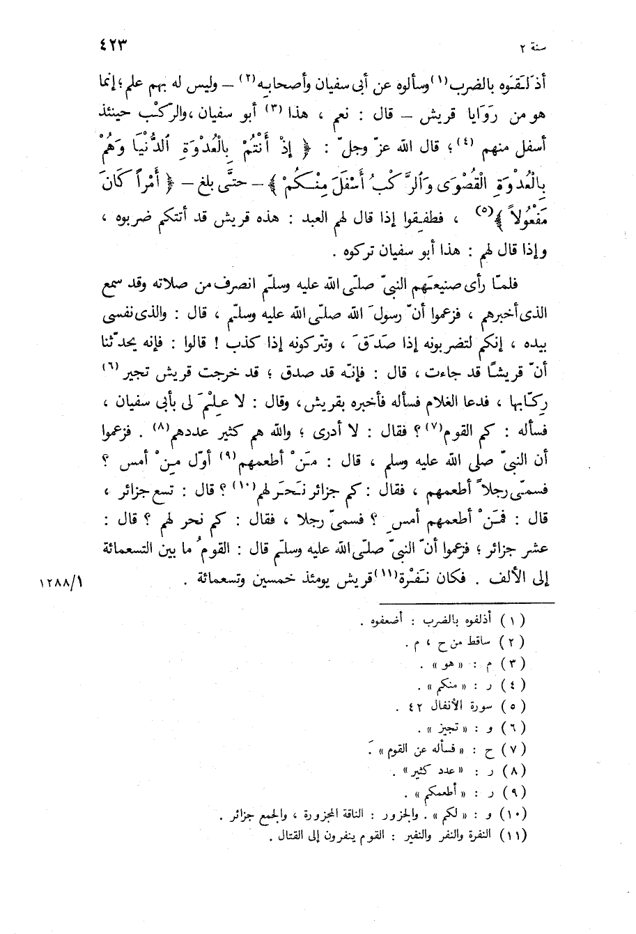 أَذْلَقُوهُ بِالضَّرْبِ وَسَأَلُوهُ عَنْ أَبِي سُفْيَانَ وَأَصْحَابِهِ- وَلَيْسَ لَهُ بِهِمْ عِلْمٌ، إِنَّمَا هُوَ مِنْ رَوَايَا قُرَيْشٍ- قَالَ: نَعَمْ، هَذَا أَبُو سُفْيَانَ، وَالرَّكْبُ حِينَئِذٍ أَسْفَلَ مِنْهُمْ، قَالَ اللَّهُ عَزَّ وَجَلَّ: «إِذْ أَنْتُمْ بِالْعُدْوَةِ الدُّنْيا وَهُمْ بِالْعُدْوَةِ الْقُصْوى وَالرَّكْبُ أَسْفَلَ مِنْكُمْ» - حَتَّى بَلَغَ- «أَمْراً كانَ مَفْعُولًا» ، فَطَفِقُوا إِذَا قَالَ لَهُمُ الْعَبْدُ: هَذِهِ قُرَيْشٌ قَدْ أَتَتْكُمْ ضَرَبُوهُ، وَإِذَا قَالَ لَهُمْ: هَذَا أَبُو سُفْيَانَ تَرَكُوهُ.