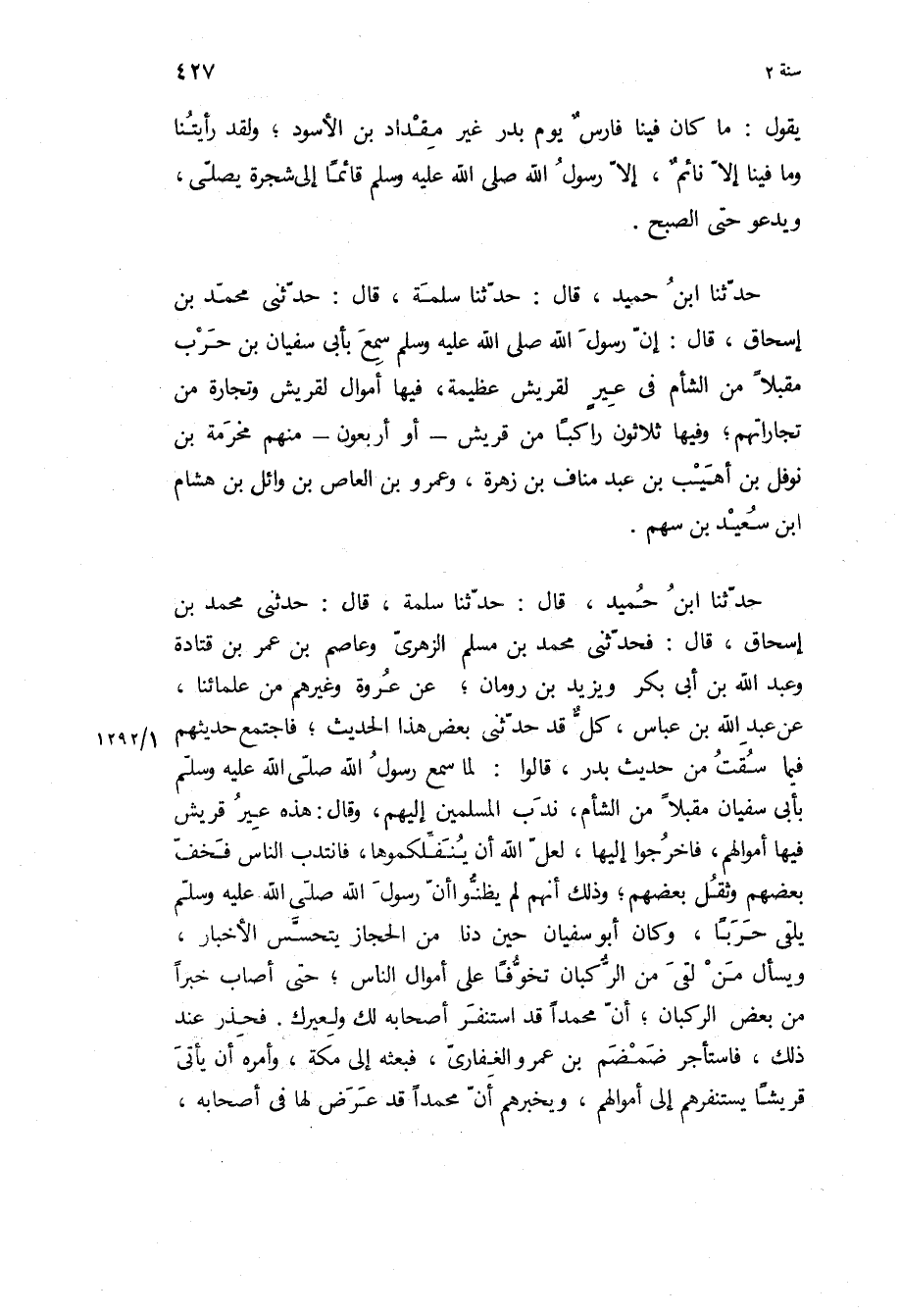 حَدَّثَنَا ابْنُ حُمَيْدٍ، قَالَ: حدثنا سلمة، قال: حدثني محمد بن إسحاق، قَالَ: فَحَدَّثَنِي مُحَمَّدُ بْنُ مُسْلِمٍ الزُّهْرِيُّ وَعَاصِمُ بْنُ عُمَرَ بْنِ قَتَادَةَ وَعَبْدُ اللَّهِ بْنُ أَبِي بَكْرٍ وَيَزِيدُ بْنُ رُومَانَ، عَنْ عُرْوَةَ وَغَيْرُهُمْ مِنْ عُلَمَائِنَا، عَنْ عَبْدِ اللَّهِ بْنِ عَبَّاسٍ، كُلٌّ قَدْ حَدَّثَنِي بَعْضَ هَذَا الْحَدِيثِ، فَاجَتْمَعَ حَدِيثُهُمْ فِيمَا سُقْتُ مِنْ حَدِيثِ بَدْرٍ، قالوا: لما سمع رسول الله ص بِأَبِي سُفْيَانَ مُقْبِلًا مِنَ الشَّامِ، نَدَبَ الْمُسْلِمِينَ إِلَيْهِمْ، وَقَالَ: هَذِهِ عِيرُ قُرَيْشٍ فِيهَا أَمْوَالُهُمْ، فَاخْرُجُوا إِلَيْهَا، لَعَلَّ اللَّهَ أَنْ يُنَفِّلَكُمُوهَا، فَانْتَدَبَ النَّاسَ فَخَفَّ بَعْضُهُمْ وَثَقُلَ بَعْضُهُمْ، وَذَلِكَ أَنَّهُمْ لم يظنوا ان رسول الله ص يَلْقَى حَرْبًا، وَكَانَ أَبُو سُفْيَانَ حِينَ دَنَا مِنَ الْحِجَازِ يَتَحَسَّسُ الأَخْبَارَ، وَيَسْأَلُ مَنْ لَقِيَ مِنَ الرُّكْبَانِ تَخَوُّفًا عَلَى أَمْوَالِ النَّاسِ، حَتَّى أَصَابَ خَبَرًا مِنْ بَعْضِ الرُّكْبَانِ، أَنَّ مُحَمَّدًا قَدِ اسْتَنْفَرَ أَصْحَابَهُ لَكَ وَلِعِيرِكَ فَحَذِرَ عِنْدَ ذَلِكَ، فَاسْتَأْجَرَ ضَمْضَمَ بْنَ عَمْرٍو الْغِفَارِيَّ، فَبَعَثَهُ إِلَى مَكَّةَ، وَأَمَرَهُ أَنْ يَأْتِيَ قُرَيْشًا يَسْتَنْفِرَهُمْ إِلَى أَمْوَالِهِمْ، وَيُخْبِرَهُمْ أَنَّ مُحَمَّدًا قَدْ عَرَضَ لَهَا فِي أَصْحَابِهِ،